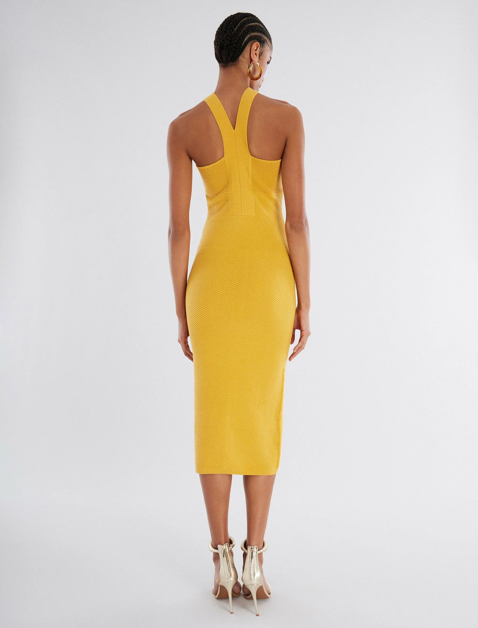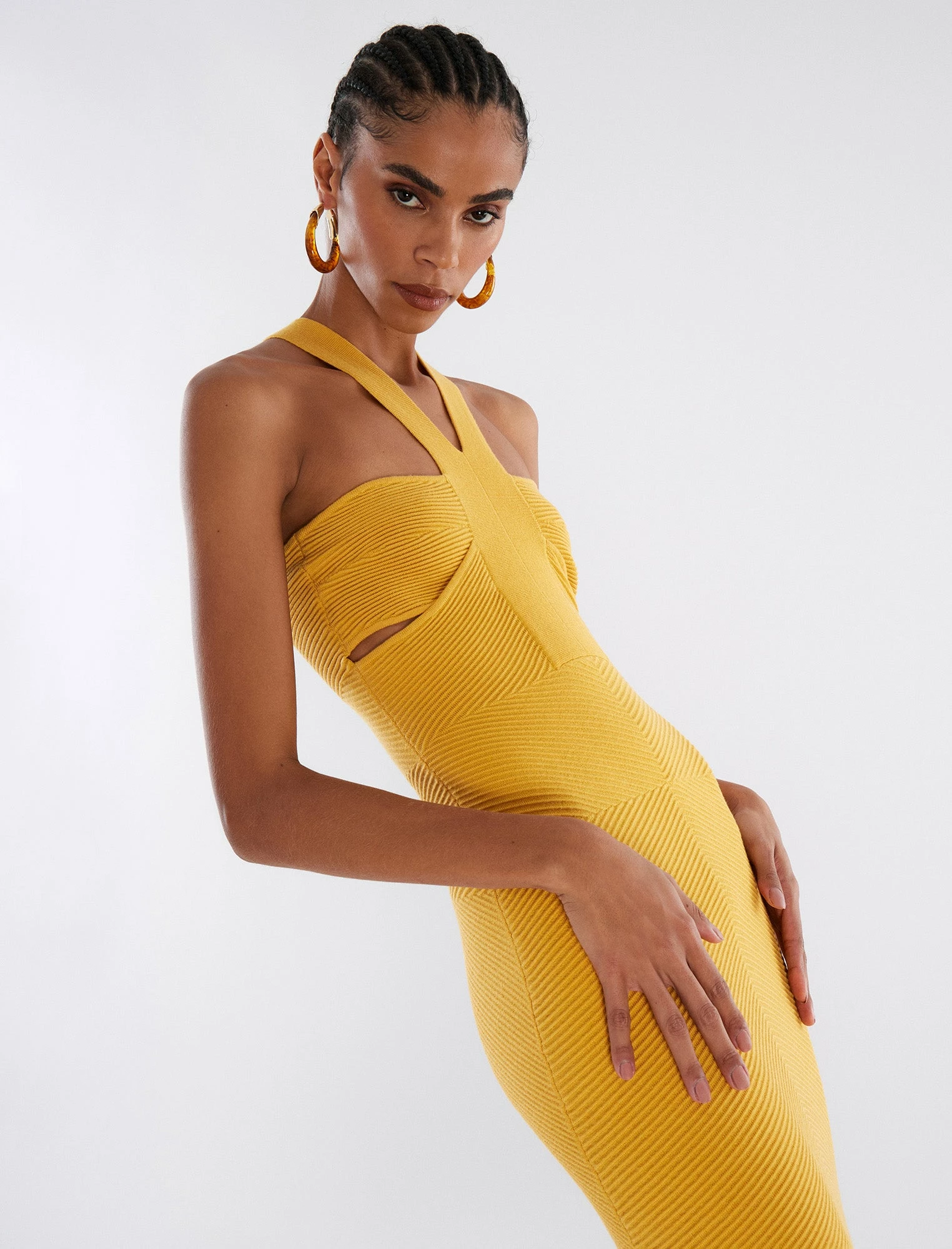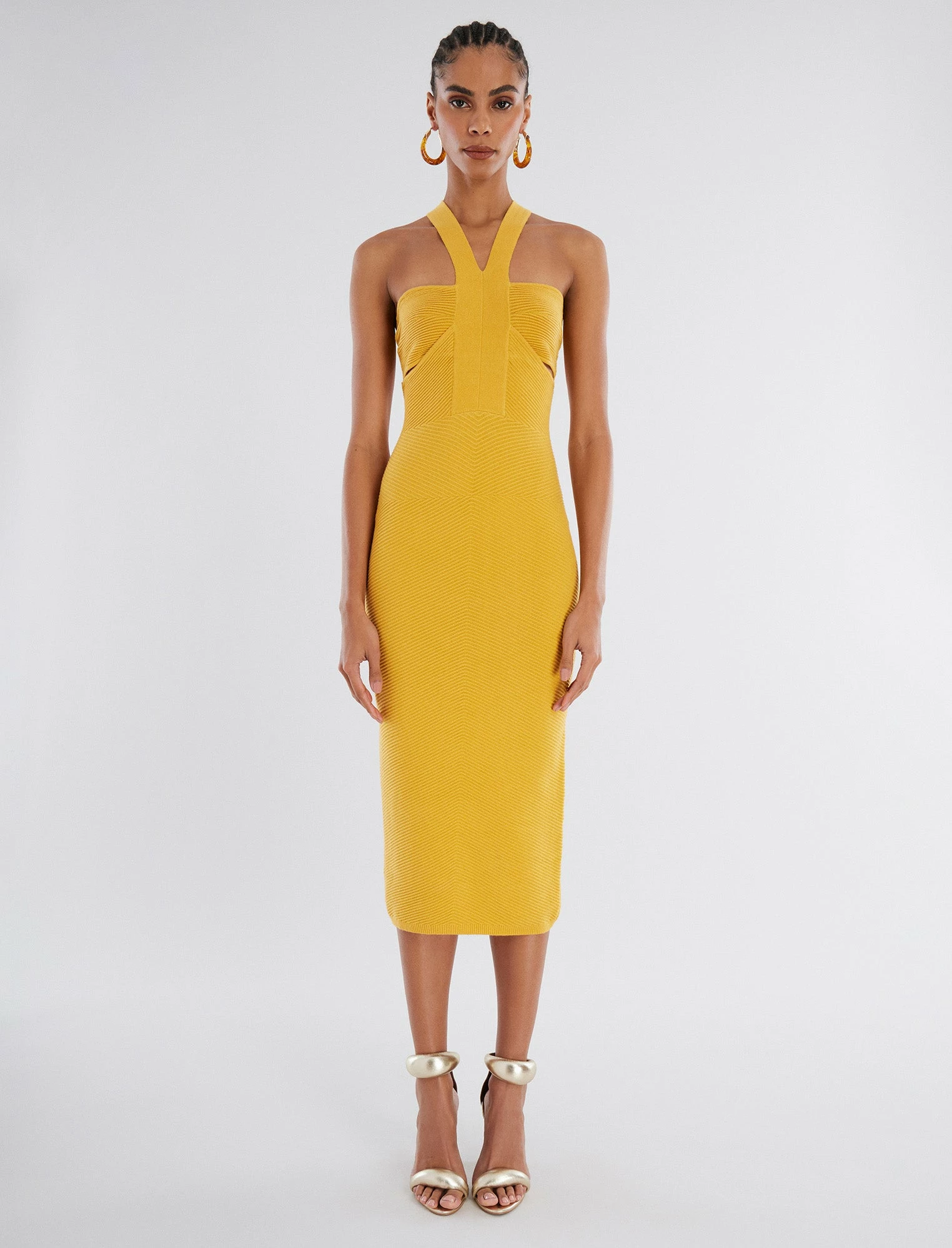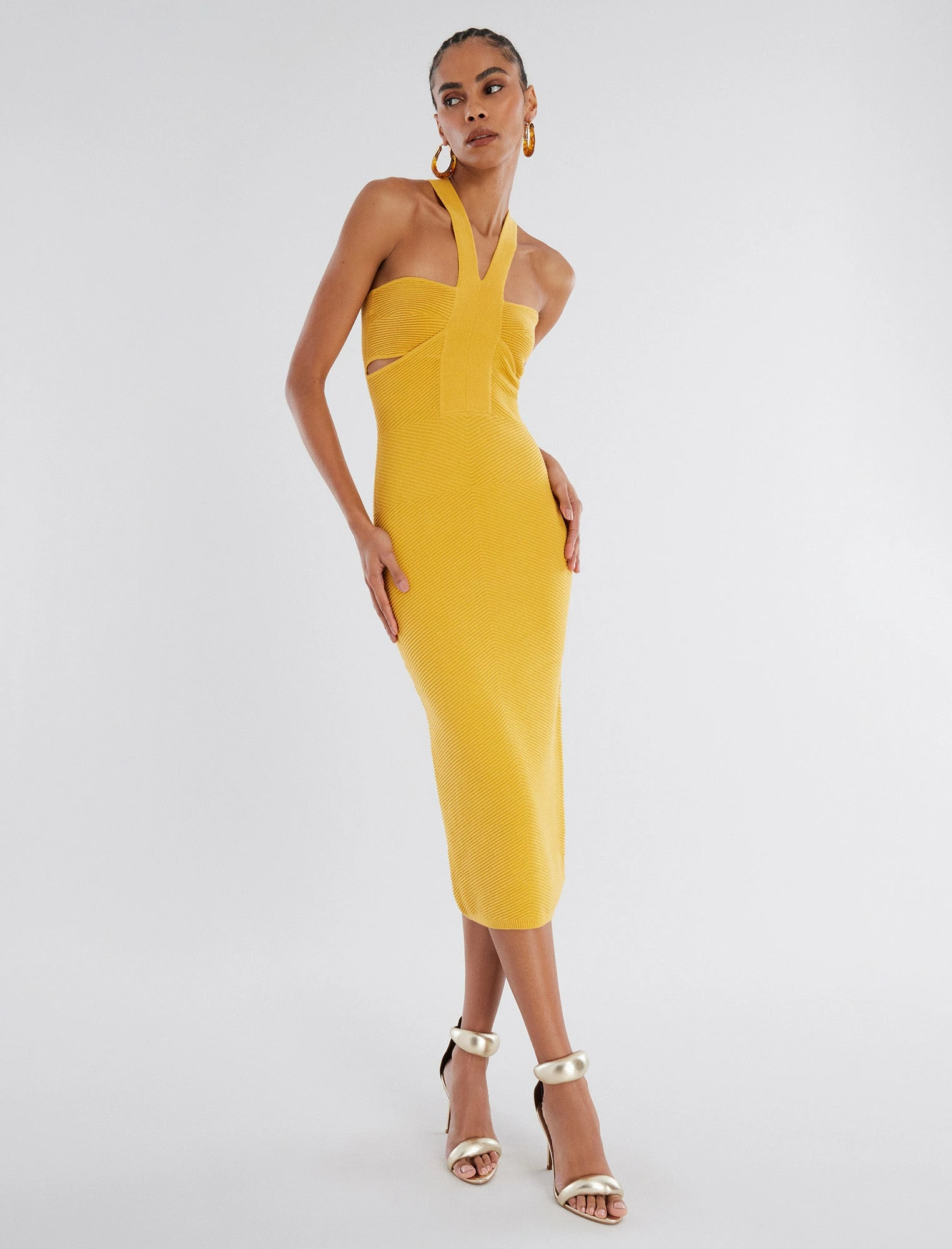 Head-turning midi dress cut from a textured rib knit. Topped with halter straps on a bandeau bust with cutouts for a modern finish. Complete in a form-fitting silhouette that effortlessly hugs the frame.