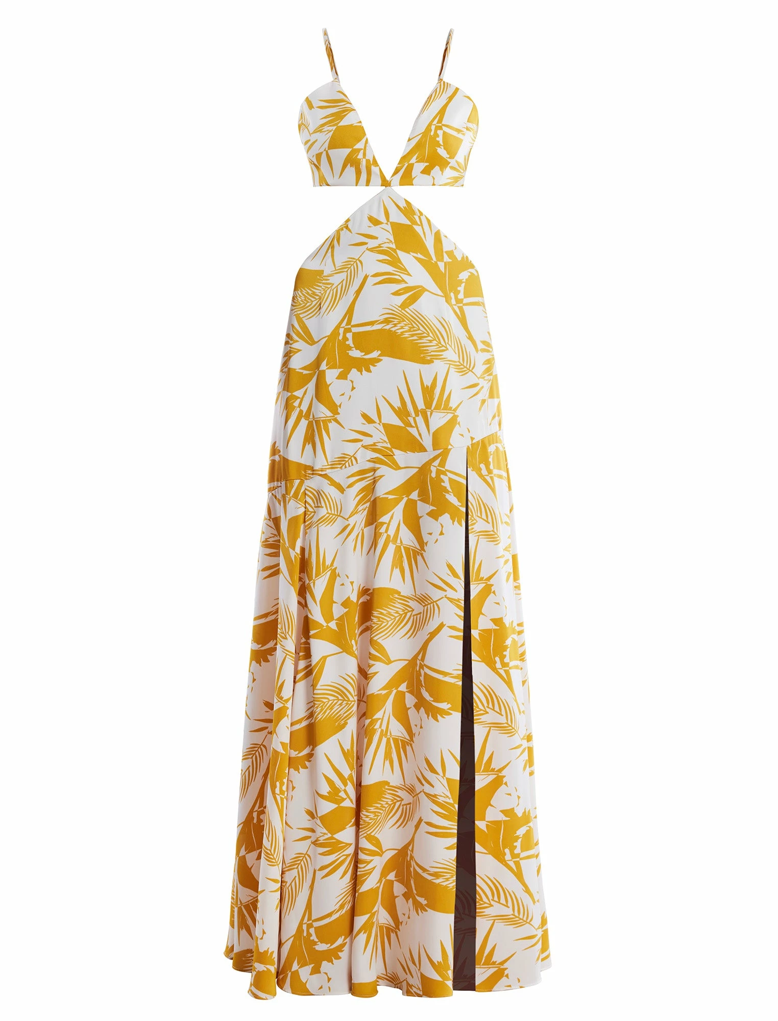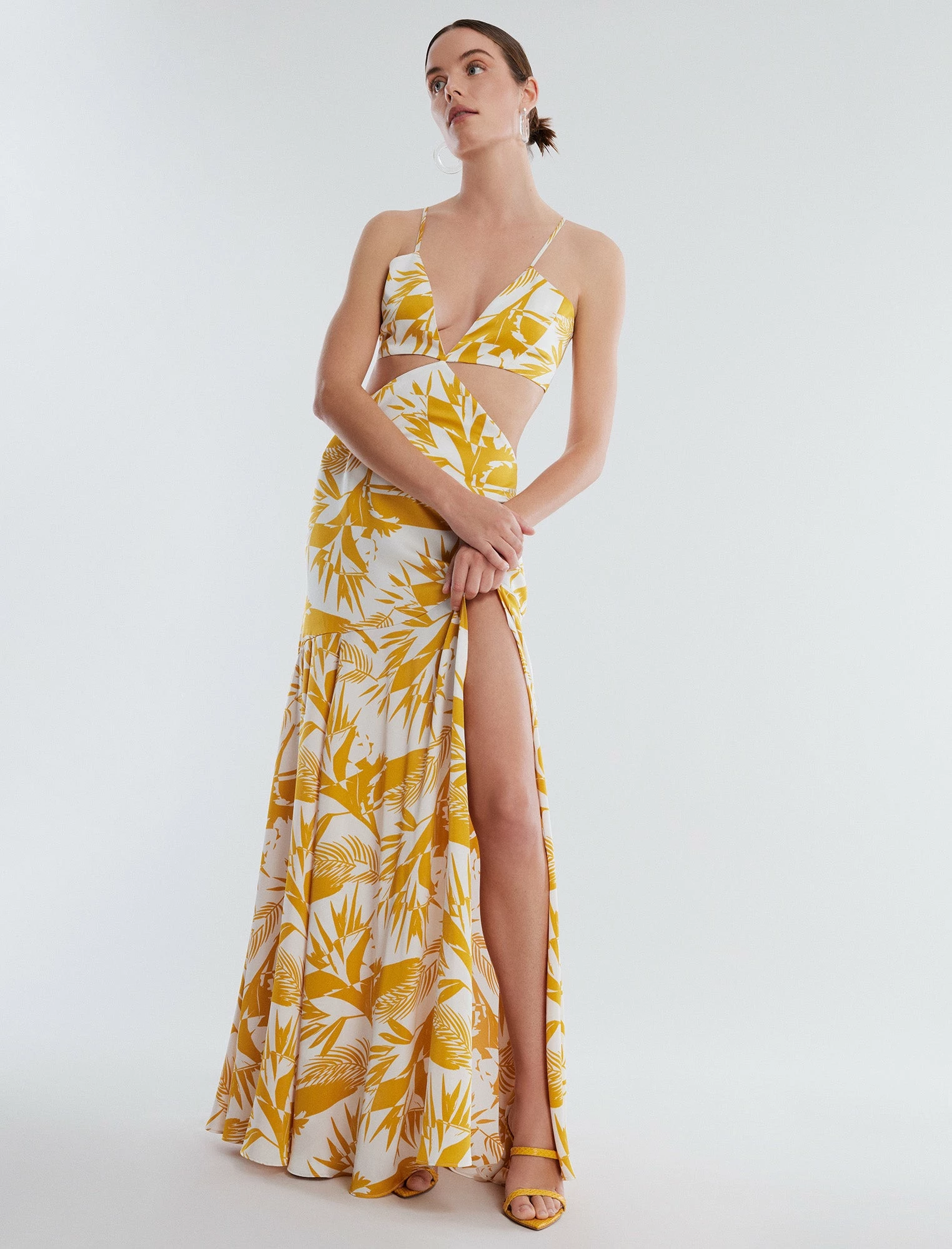 Stunning yellow and white printed silky satin gown. Done in a modern cutout design with an exposed waist and open back. Made with a plunging V-neck supported by spaghetti straps. Top features a side zip and skirt is built with a back zip.