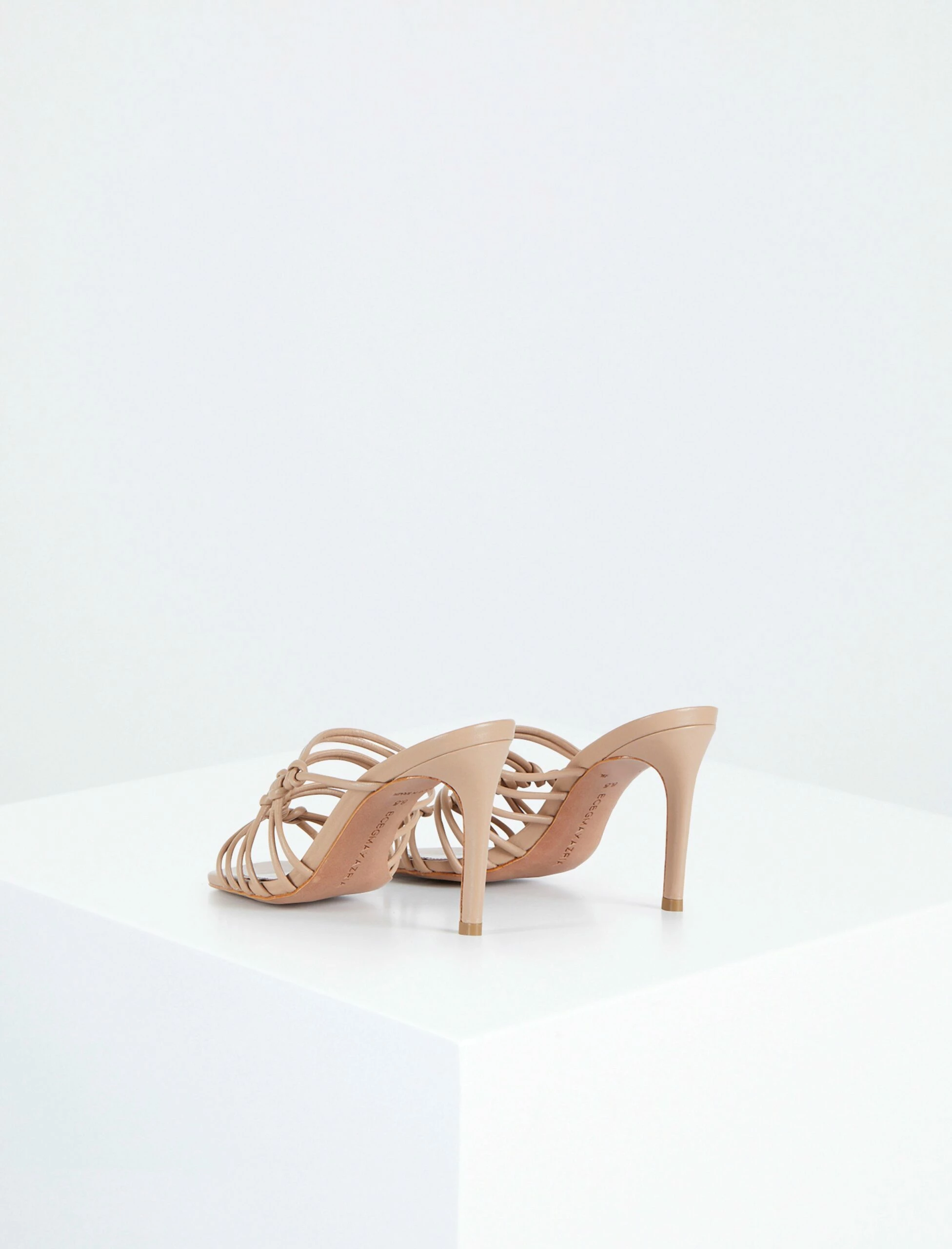 Chic slip-on sandal crafted from leather in a multi strap design with knotted accents. Framed by a modern square toe and finished with a sleek stiletto heel.