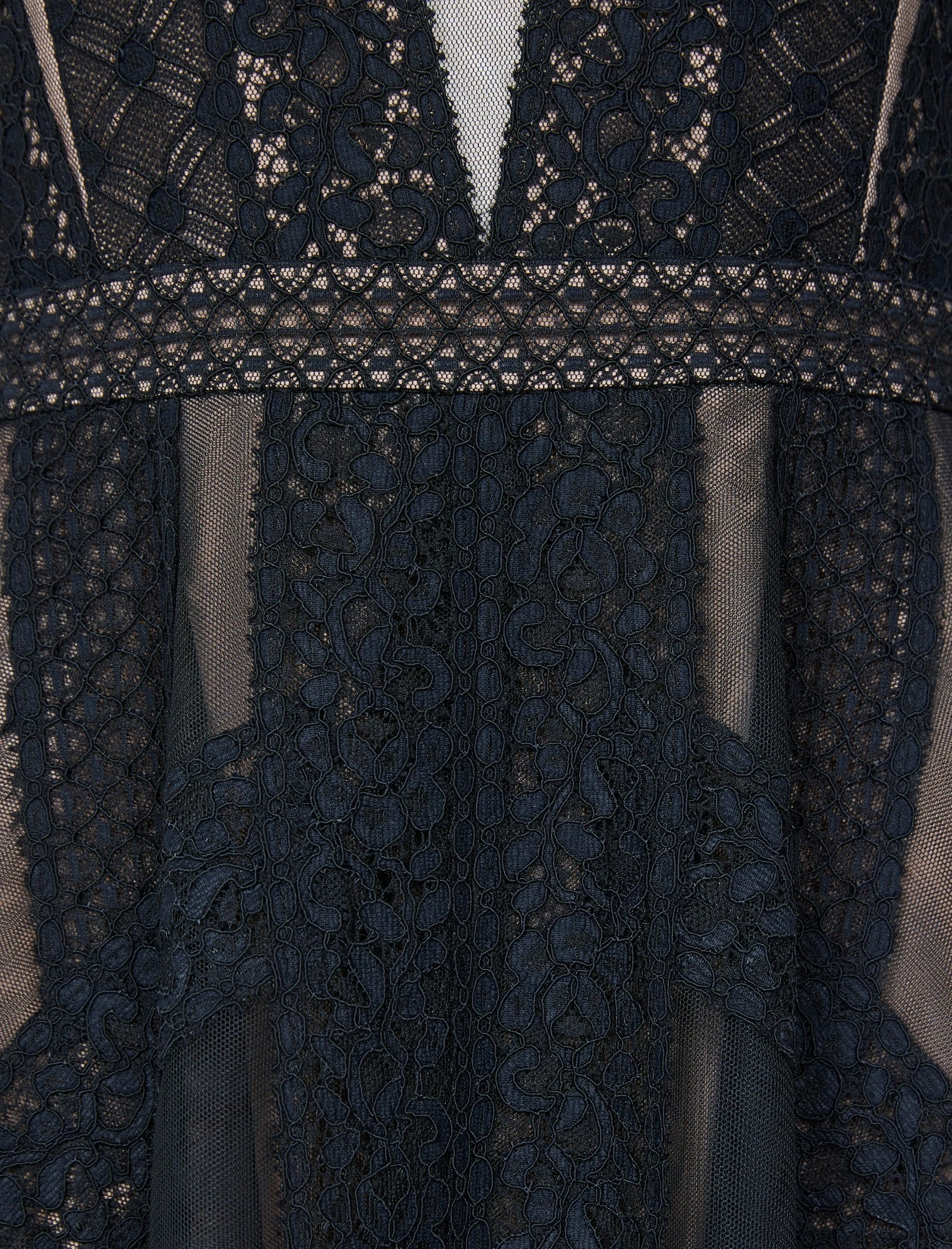 Ethereal dress with layered tulle and lace detailing for maximum drama. Topped with a mesh-overlaid V-neck and a sleeveless silhouette. Fitted at the waist for a nipped-in look and finished with a luxe handkerchief hem.