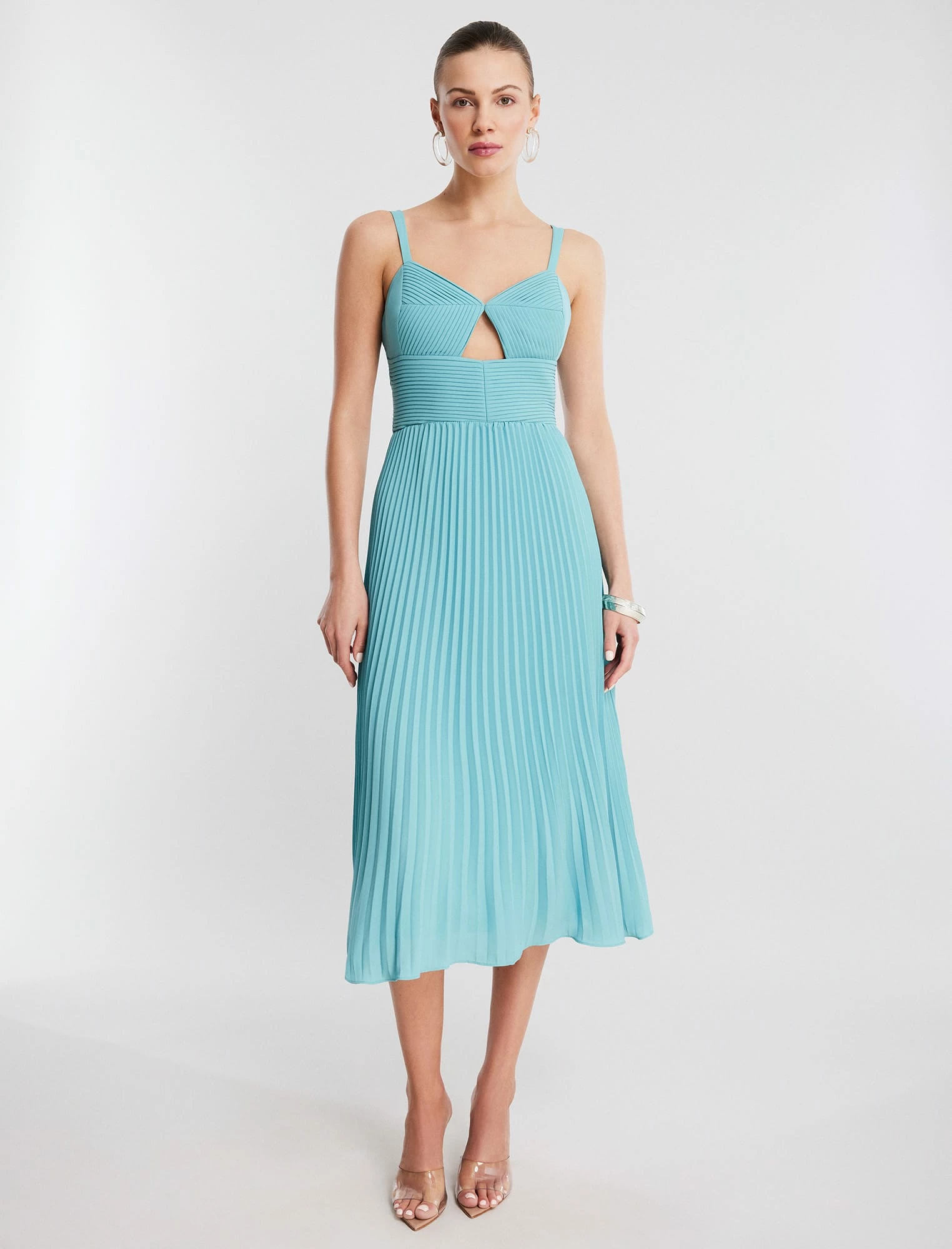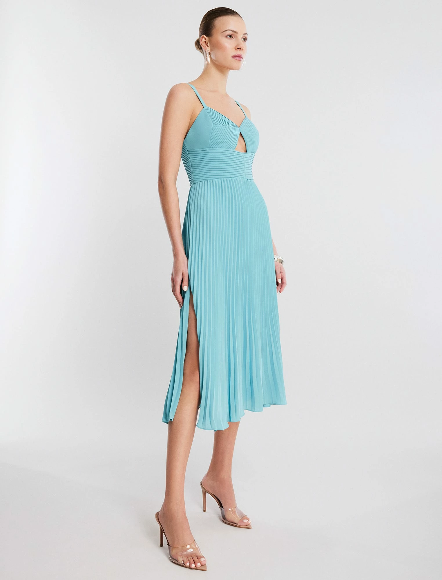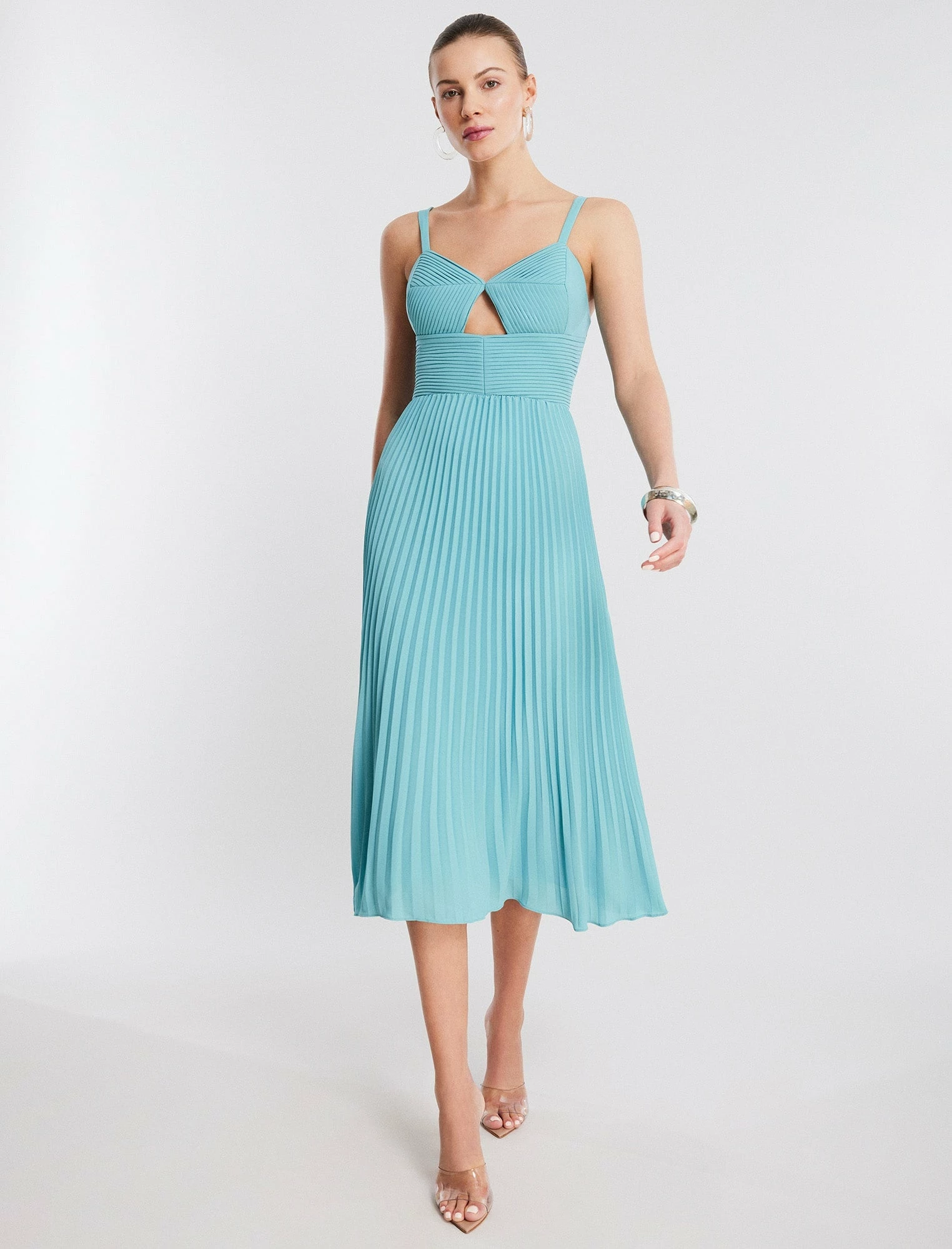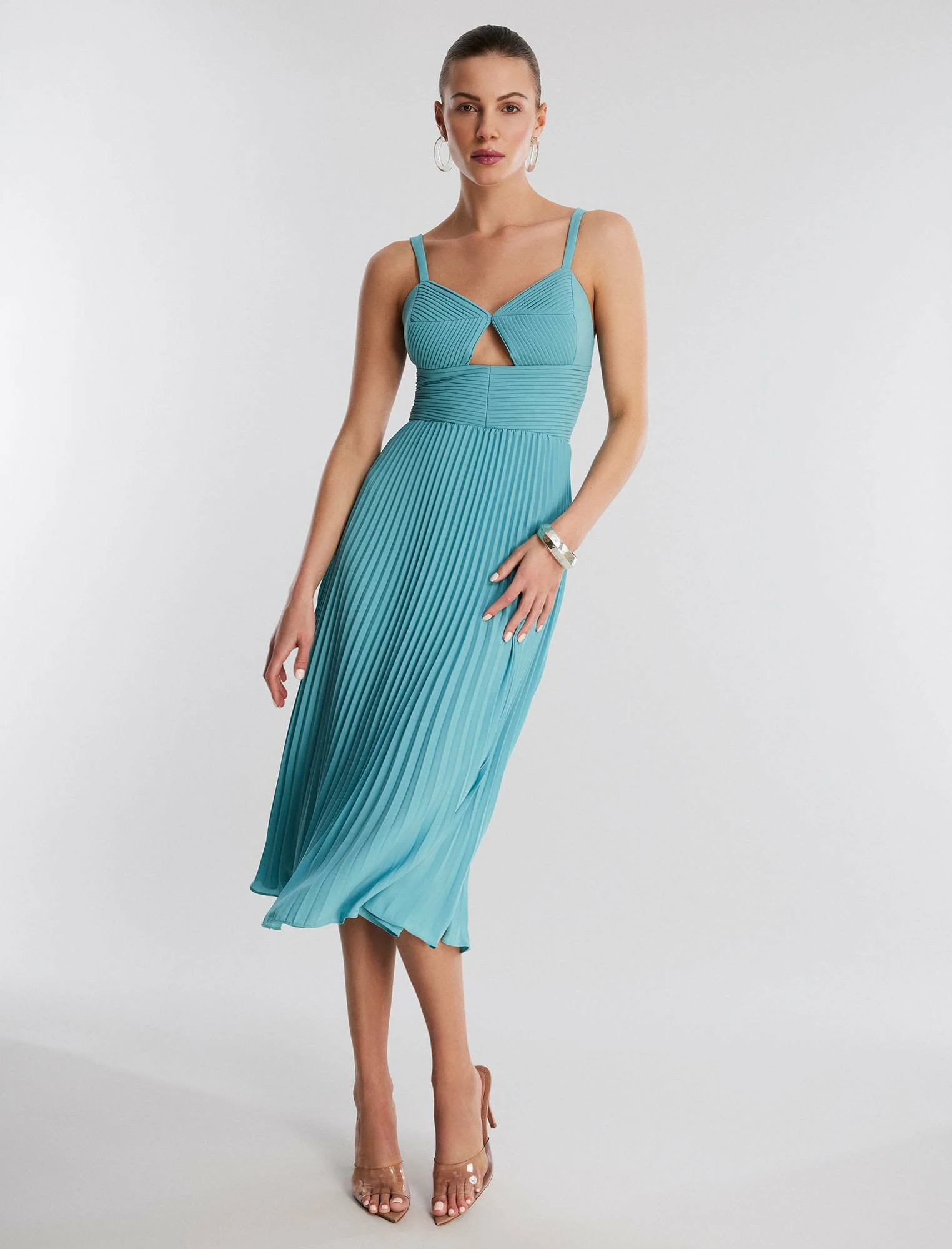 Polished turquoise midi dress with a feminine mood. Cut from pleated silky Georgette for soft movement. Done with a structured bust and a keyhole cutout supported by fixed wide straps. Complete in a fit-and-flare style that’s finished with a back zip and fully lined.