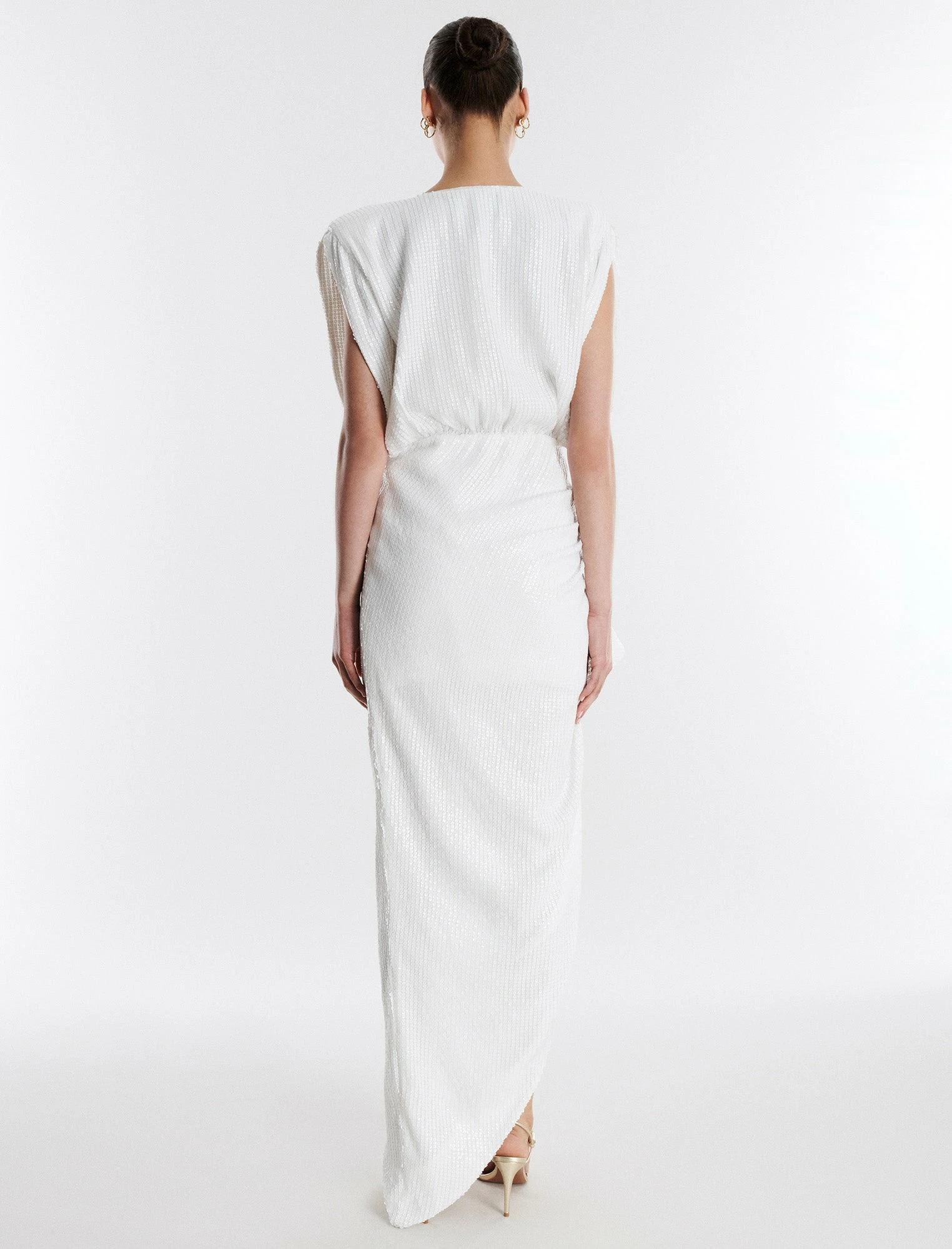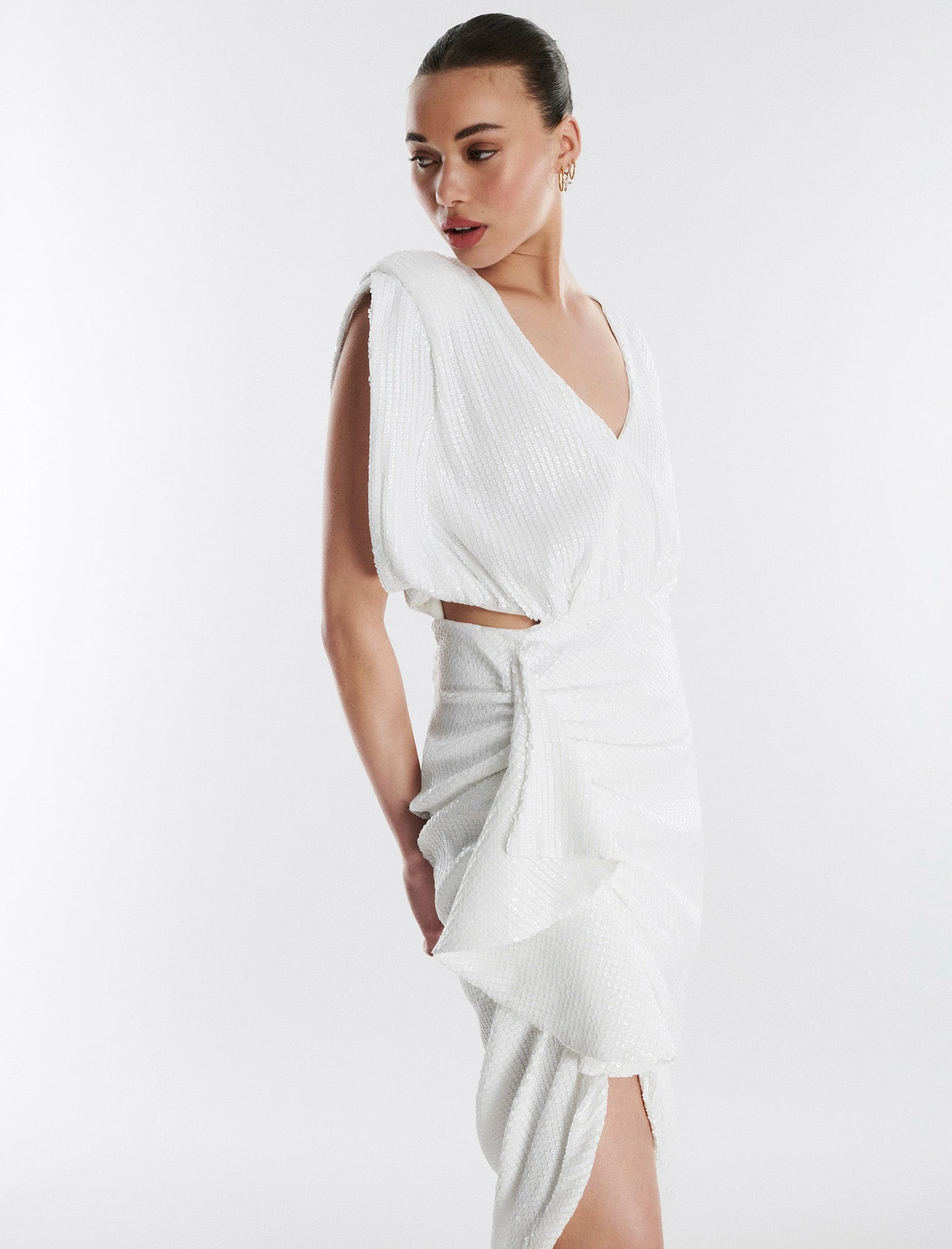 Sparkling white gown done from shimmering sequins. Crafted with oversized cap sleeves and structured shoulder pads for a bold look that’s balanced by a feminine faux wrap skirt. Detailed with a waist cutout, the skirt features ruching with a cascading ruffle, highlighting a high-low hem. Complete with a concealed side zip.