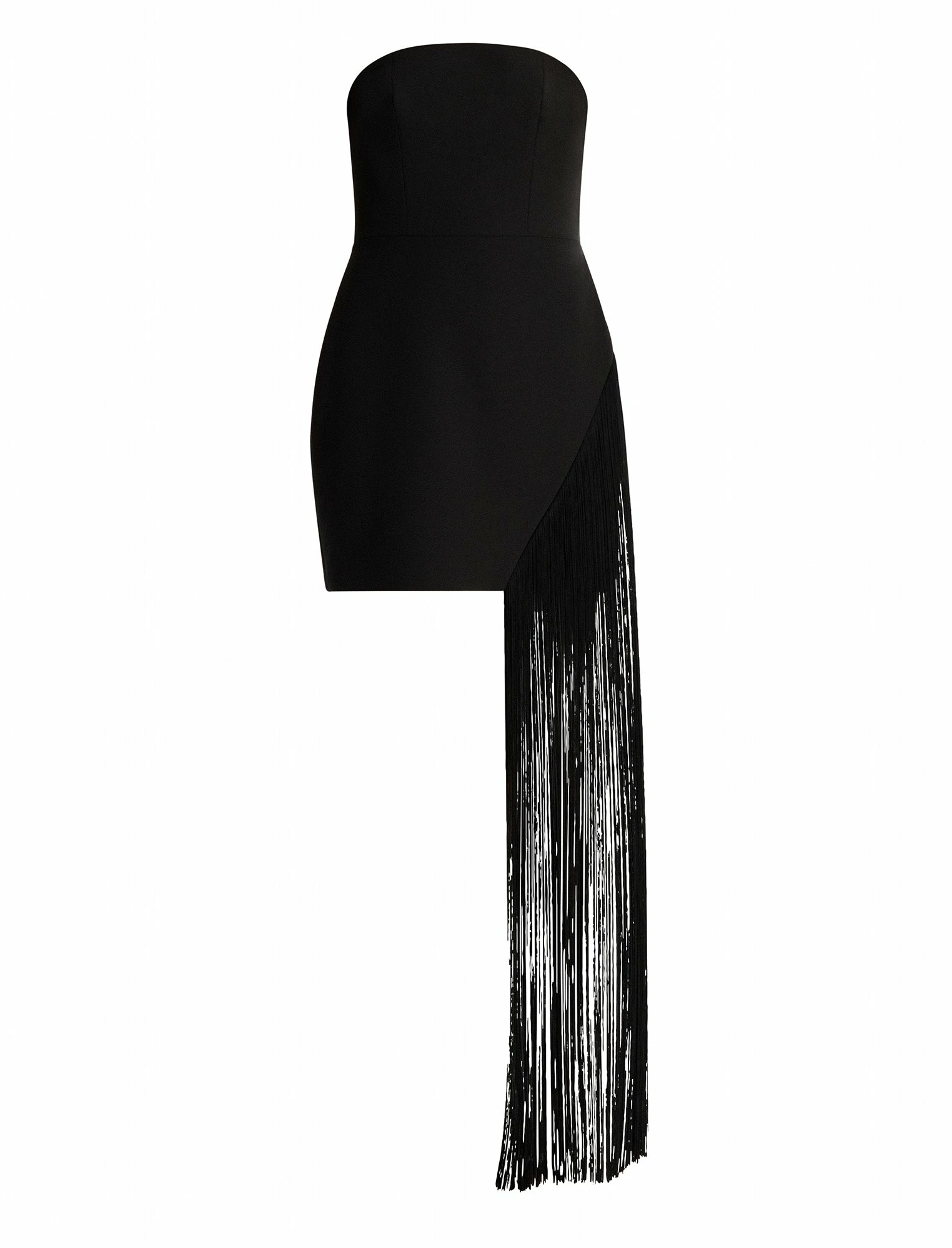 Perfect modern black mini dress. Done from double face crepe in a minimal strapless design with a fitted silhouette. Detailed with asymmetrical side fringe that drapes to the floor. Complete with a concealed back zip.