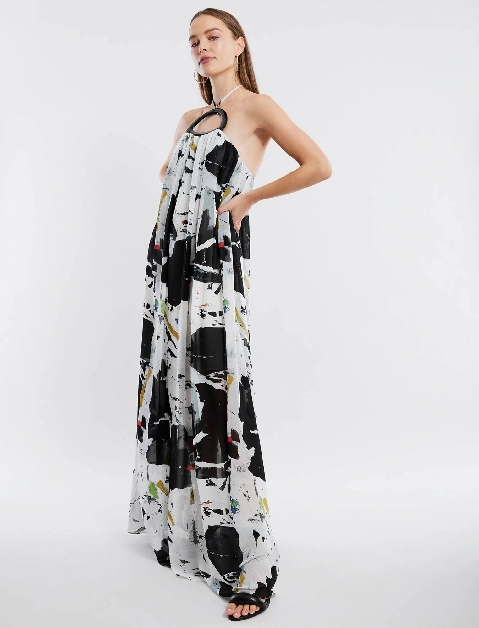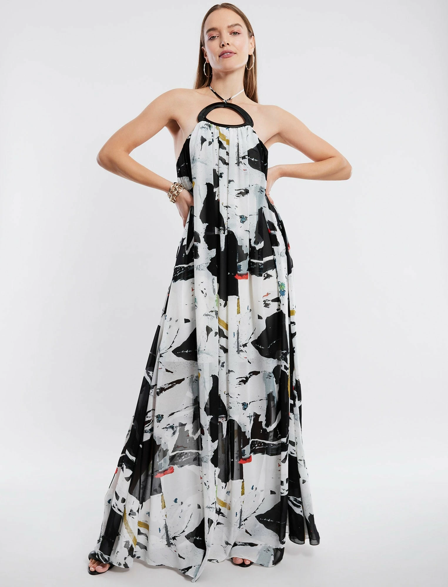 Goddess-like pullover evening gown done from a flowy printed fabric in a relaxed silhouette. Topped with self-tie halter straps and statement hardware embellishment. Finished with a low-cut back.