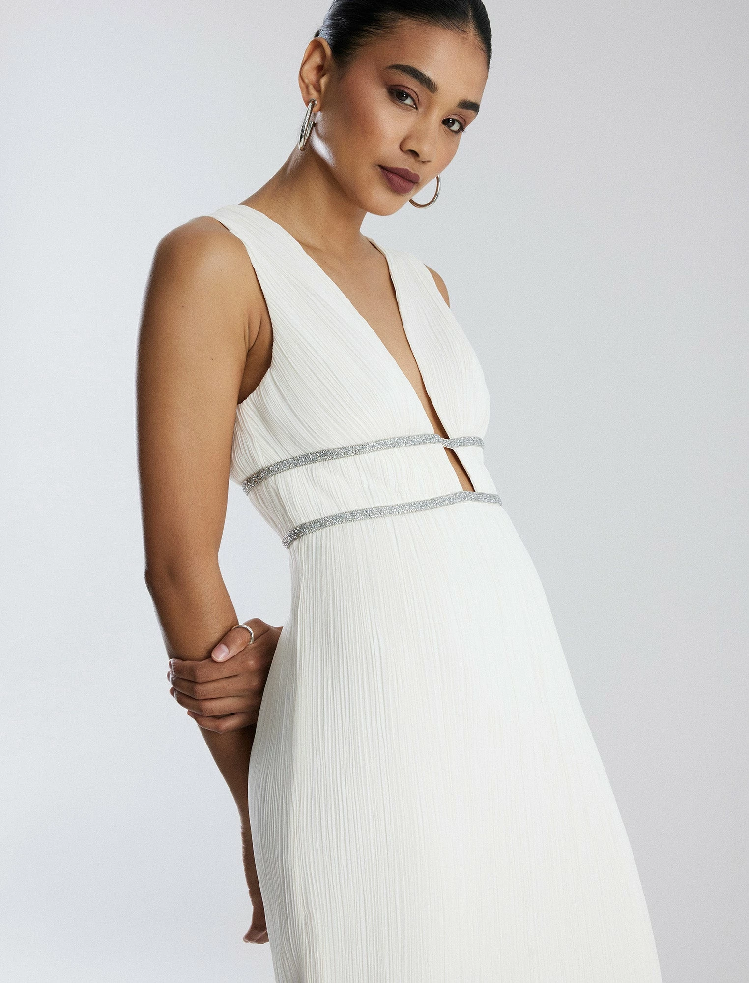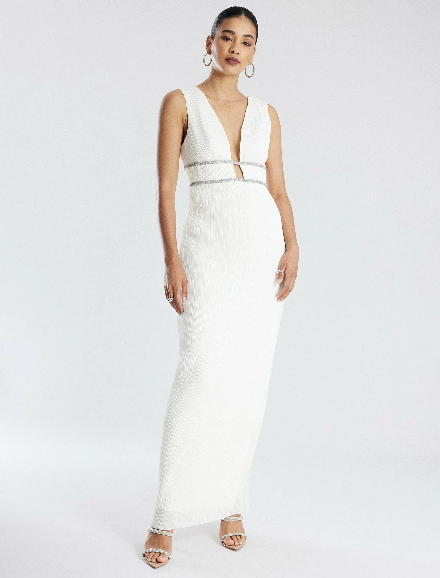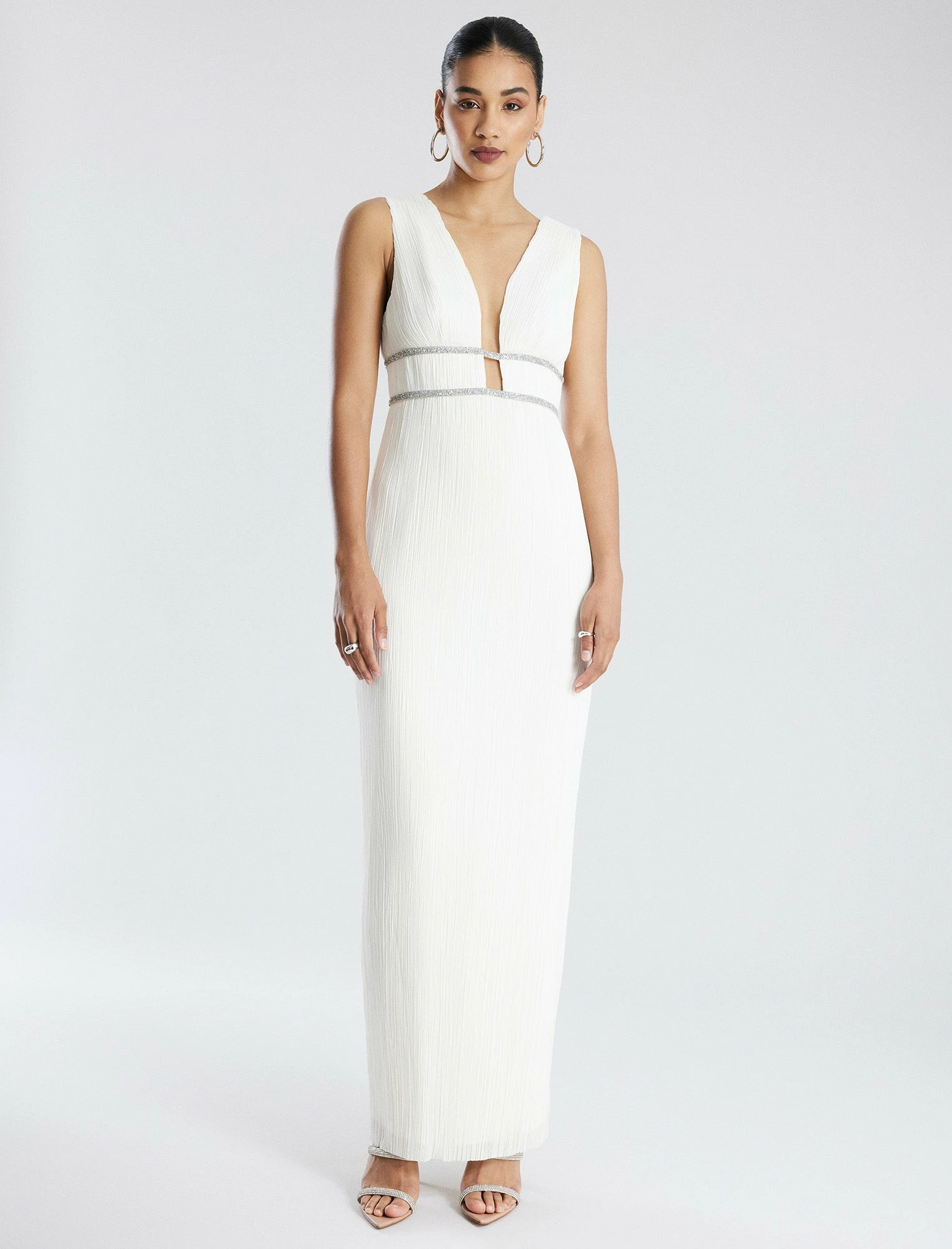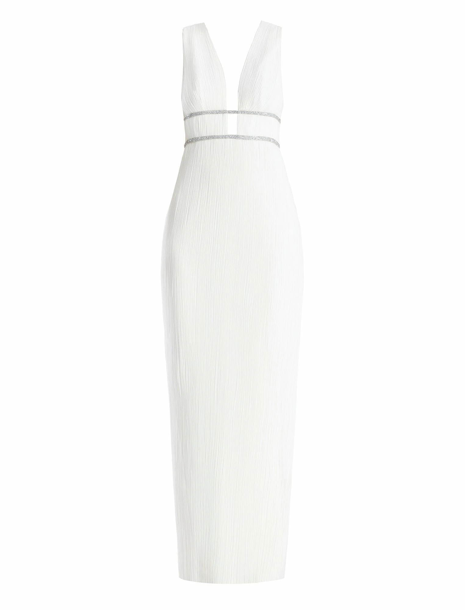 Showstopping gown in white with a goddess-inspired design. Done from pleated chiffon with a plunging V-neckline. Crafted with two sparkling beaded waistbands for a touch of glamor. Designed in a sheath style with a V-back and a concealed back zip closure.