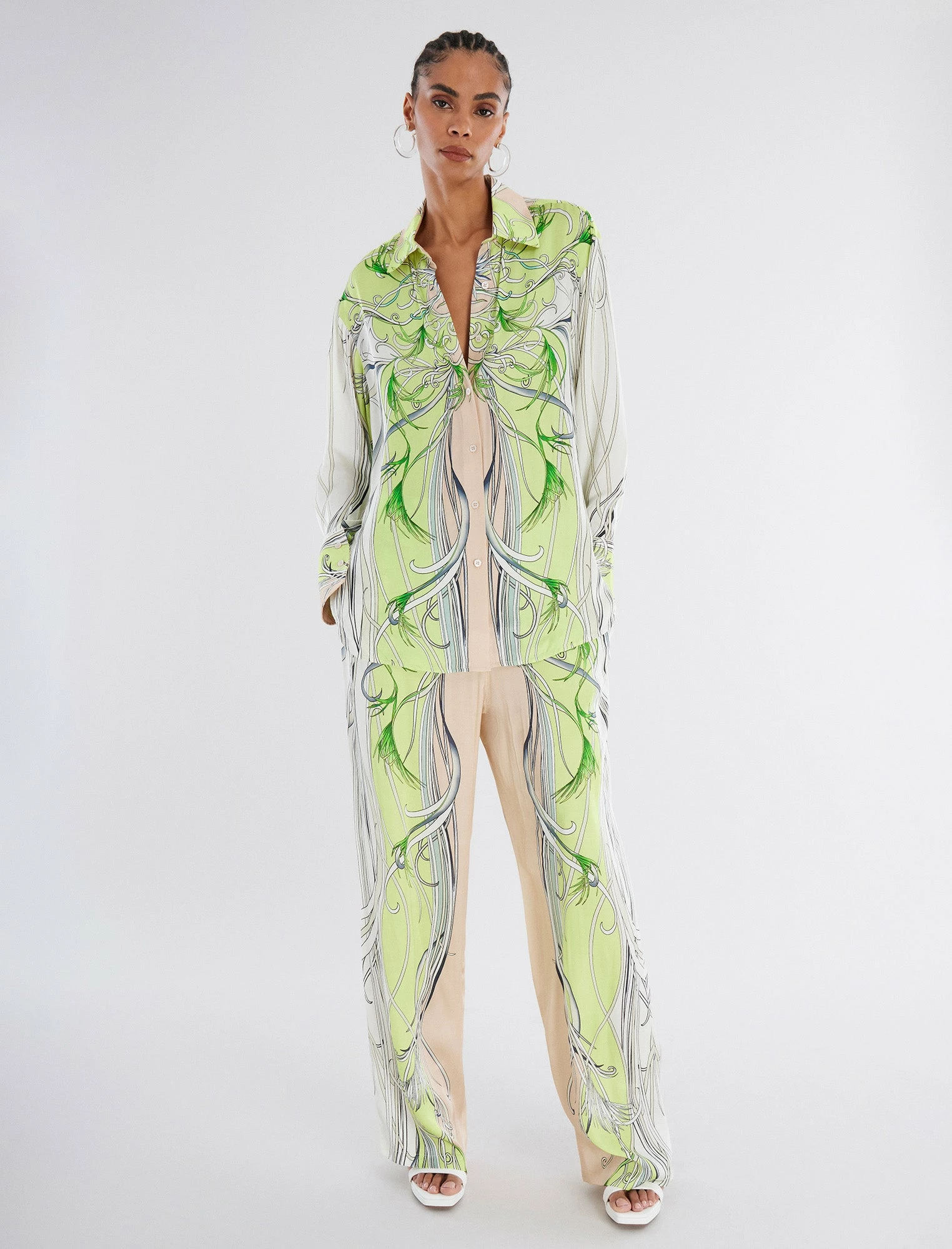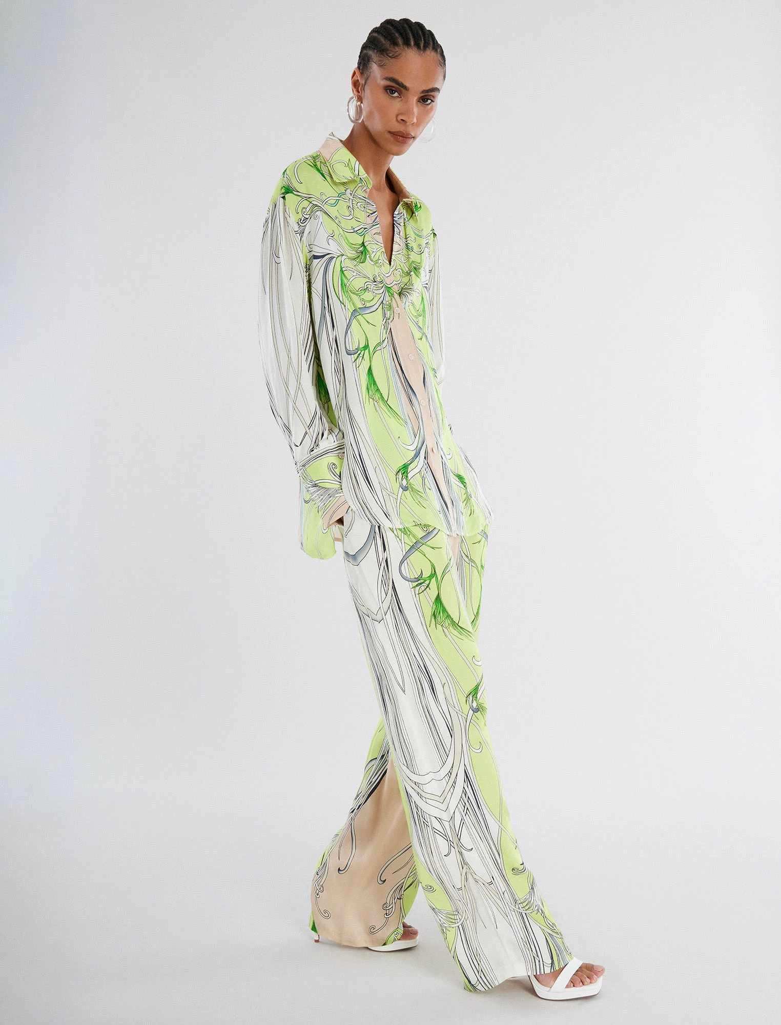 Elevated pant perfect for weekends or travel. Done in a brightly printed design. Finished in a wide-leg silhouette with front pockets.