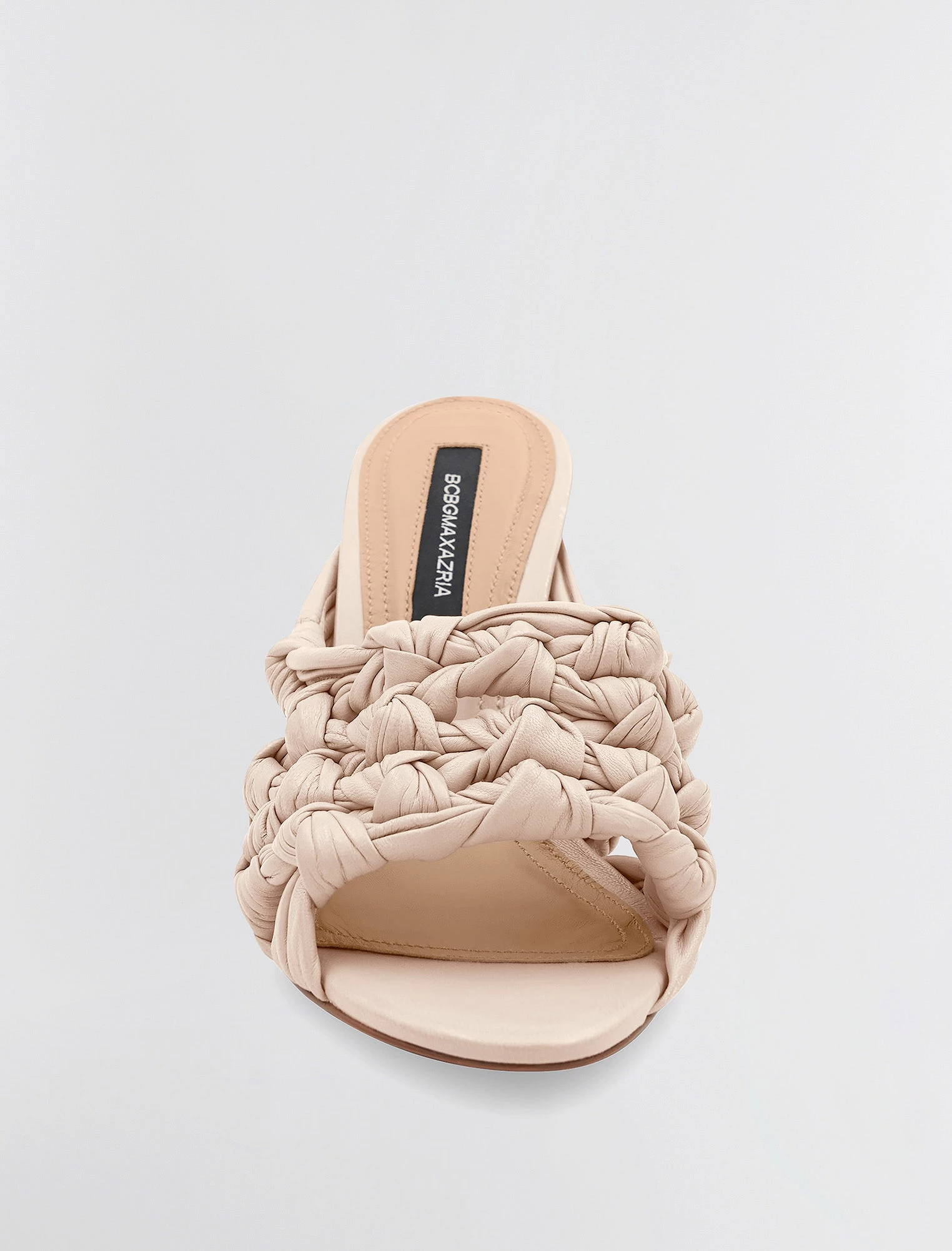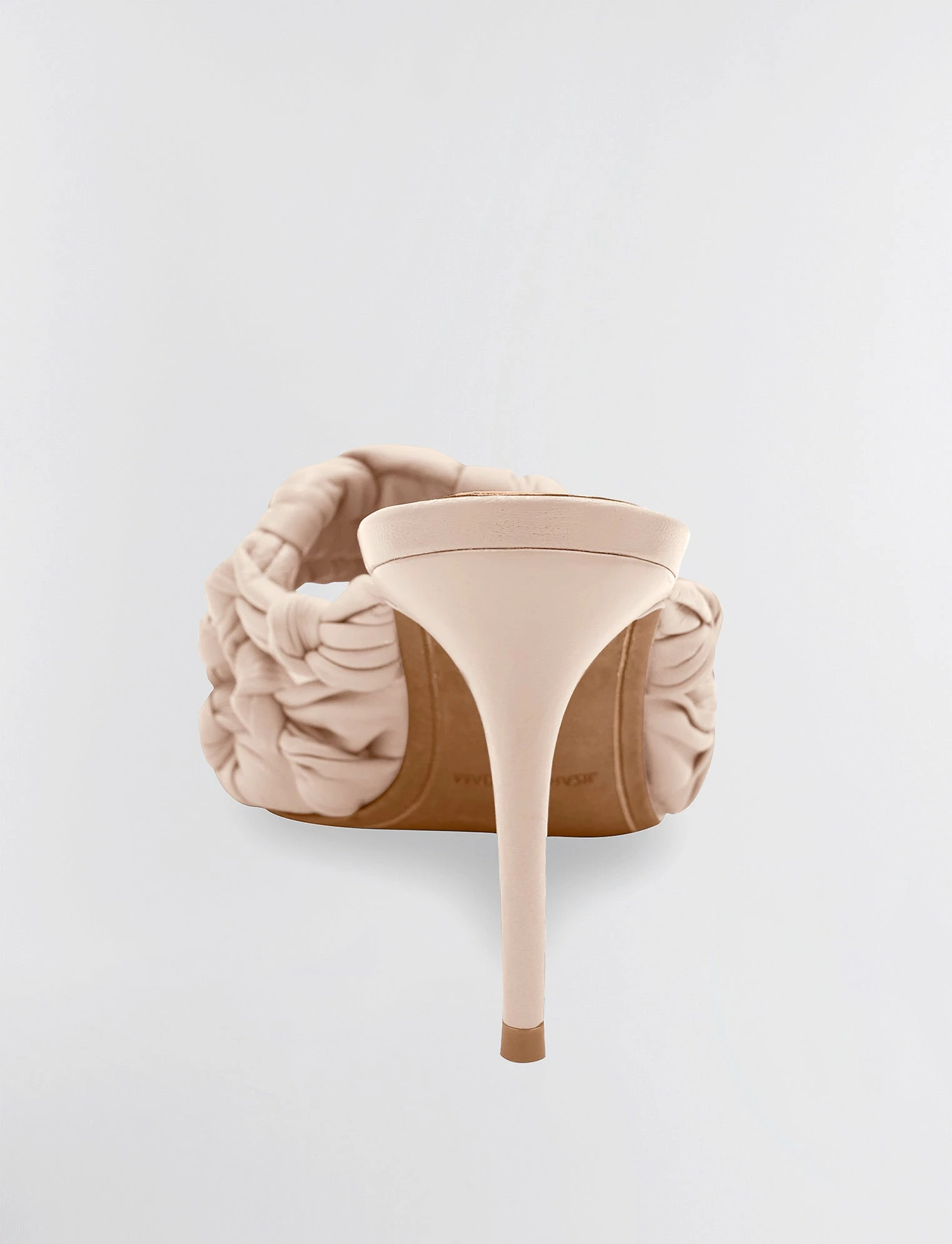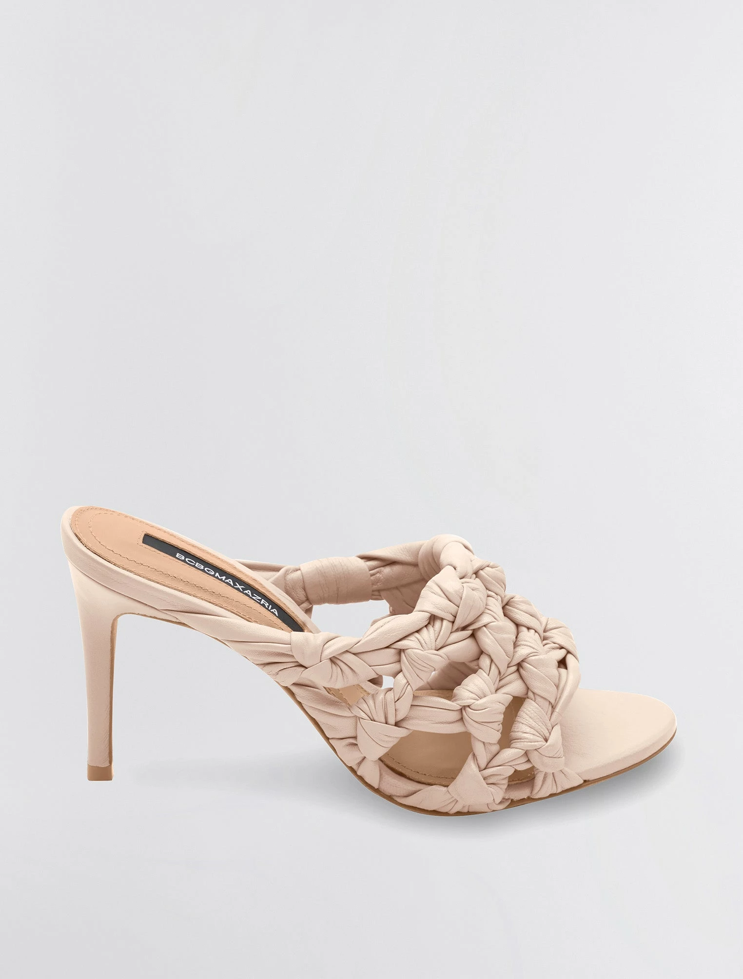 A bold mule sandal with springtime charm. Crafted from knotted leather in a simple slip-on style. Finished with a stiletto heel.