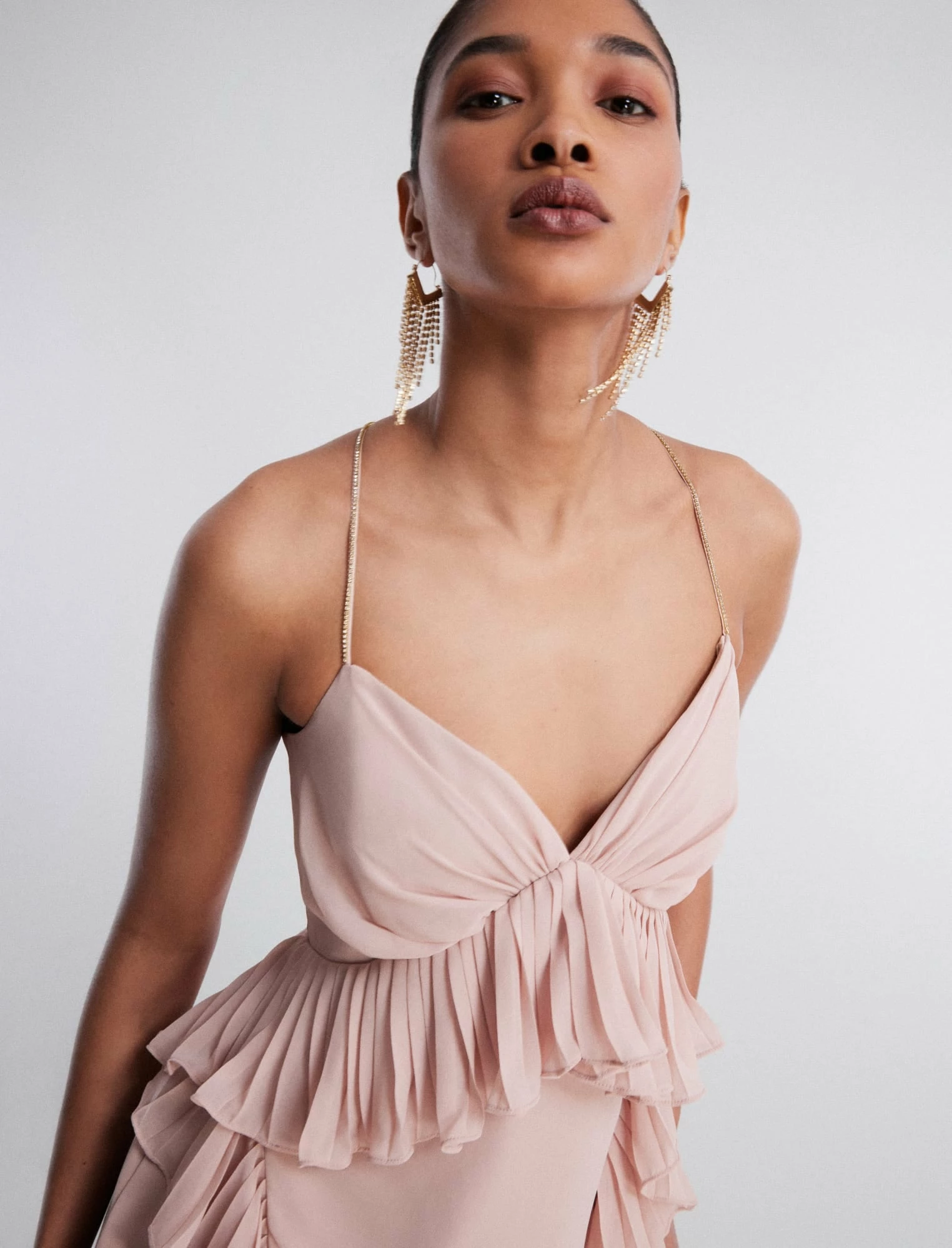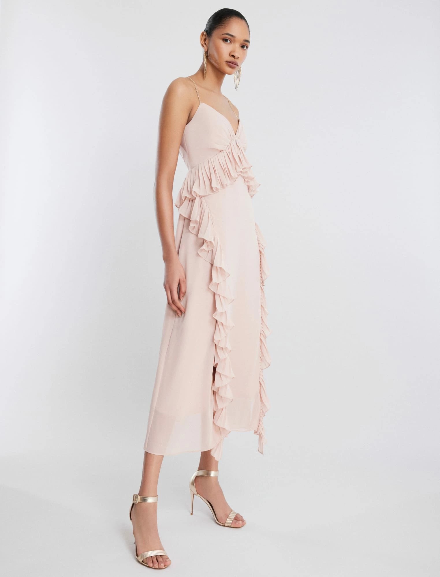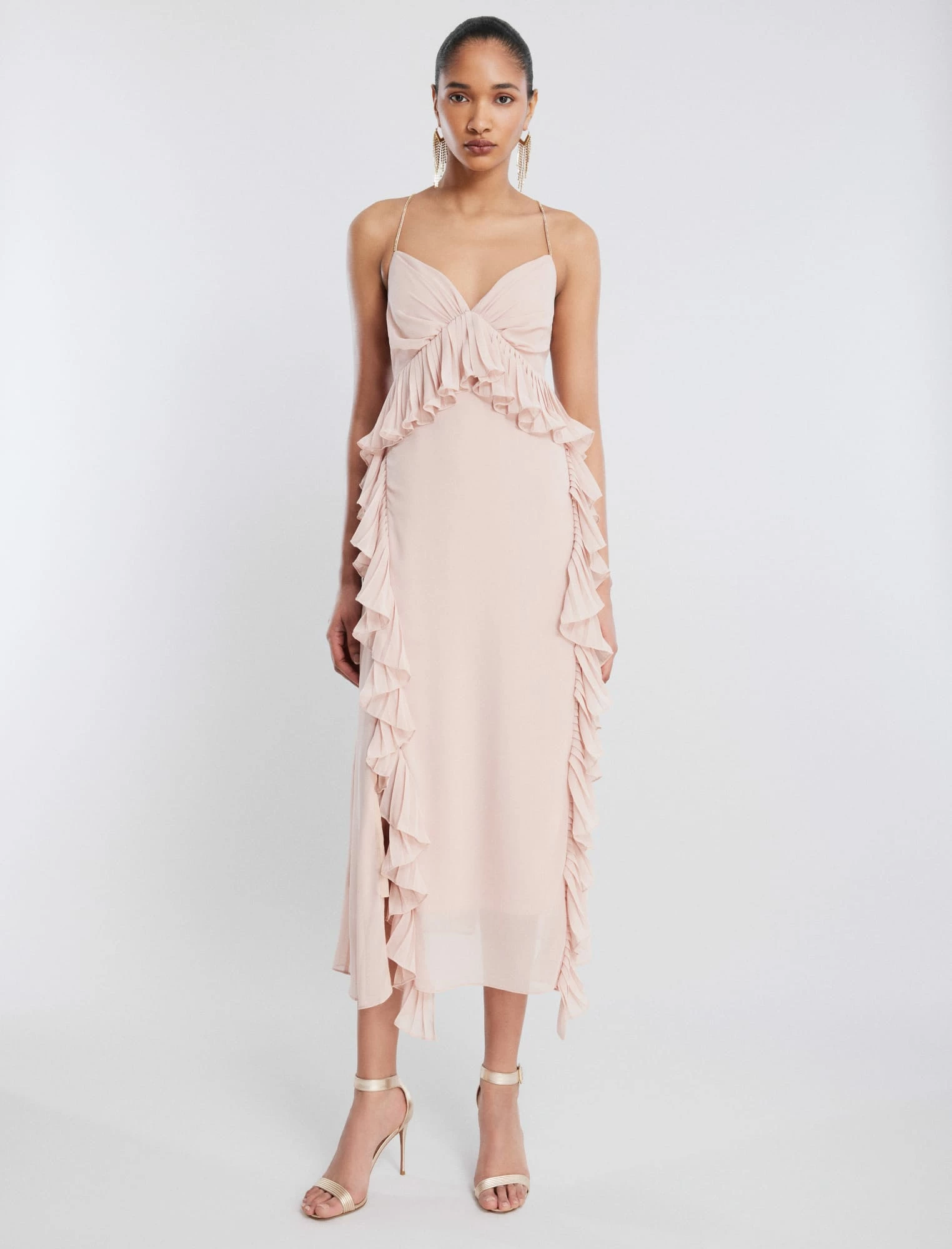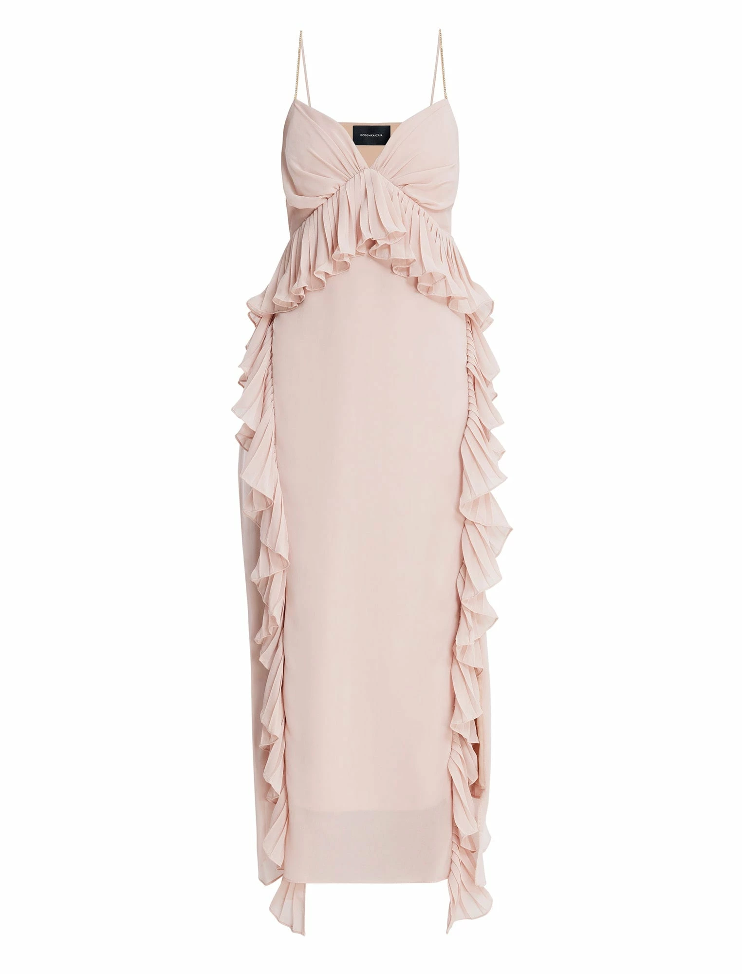 Dreamy party dress made from satin chiffon. Topped with a plunging sweetheart neck and crystal embellished shoulder straps that dangle off the back. Decorative ruffles create a natural peplum waist and cascade down the skirt. Finished with front slits that expose just enough skin with every step.