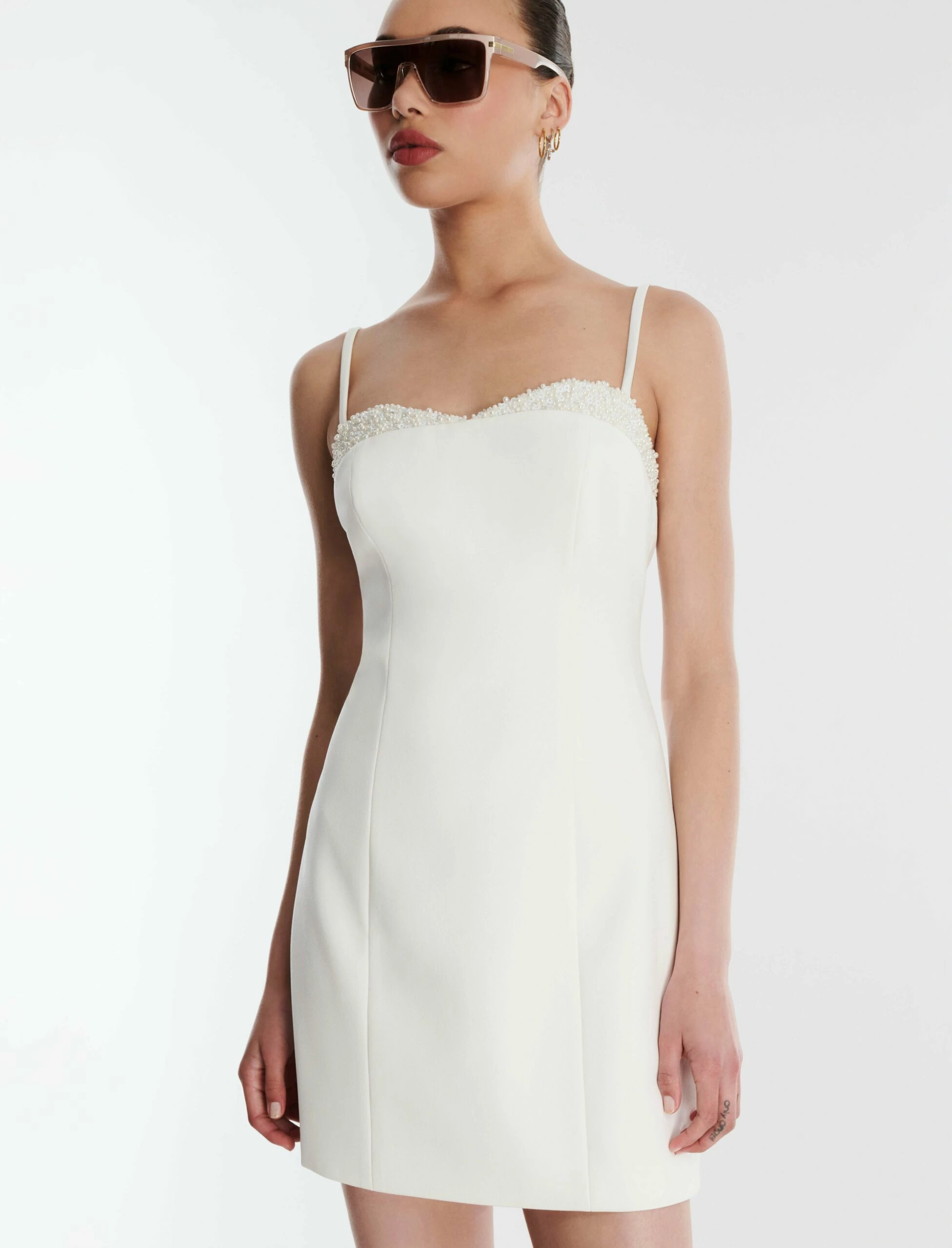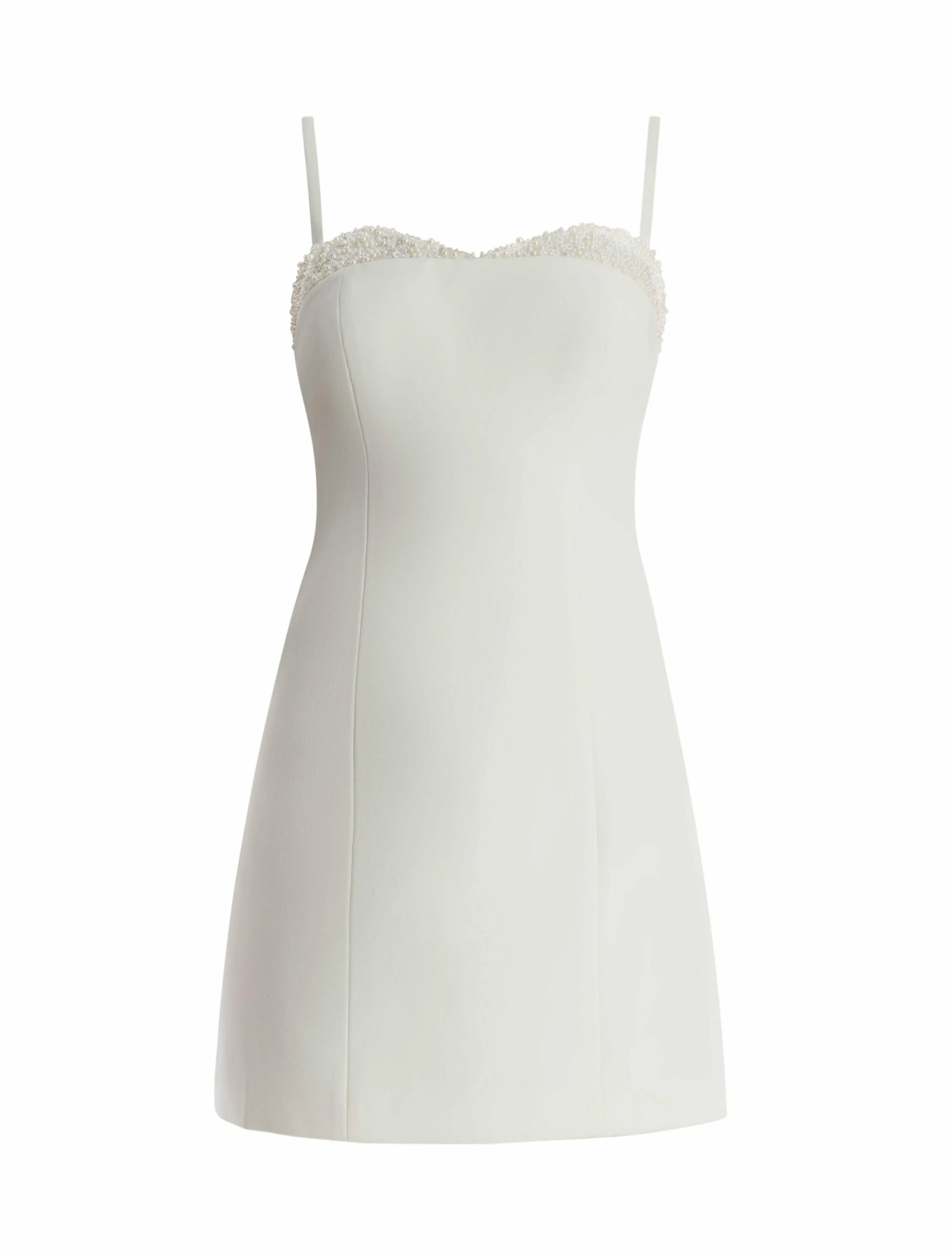 Ultra chic white mini dress cut from neo crepe. Topped with adjustable shoulder straps for a custom fit and a pearl encrusted sweetheart neck for a touch of sparkle. Designed in a flattering A-line shape that cinches the waist and accentuates the hips. Complete with a back zip and fully lined underneath.