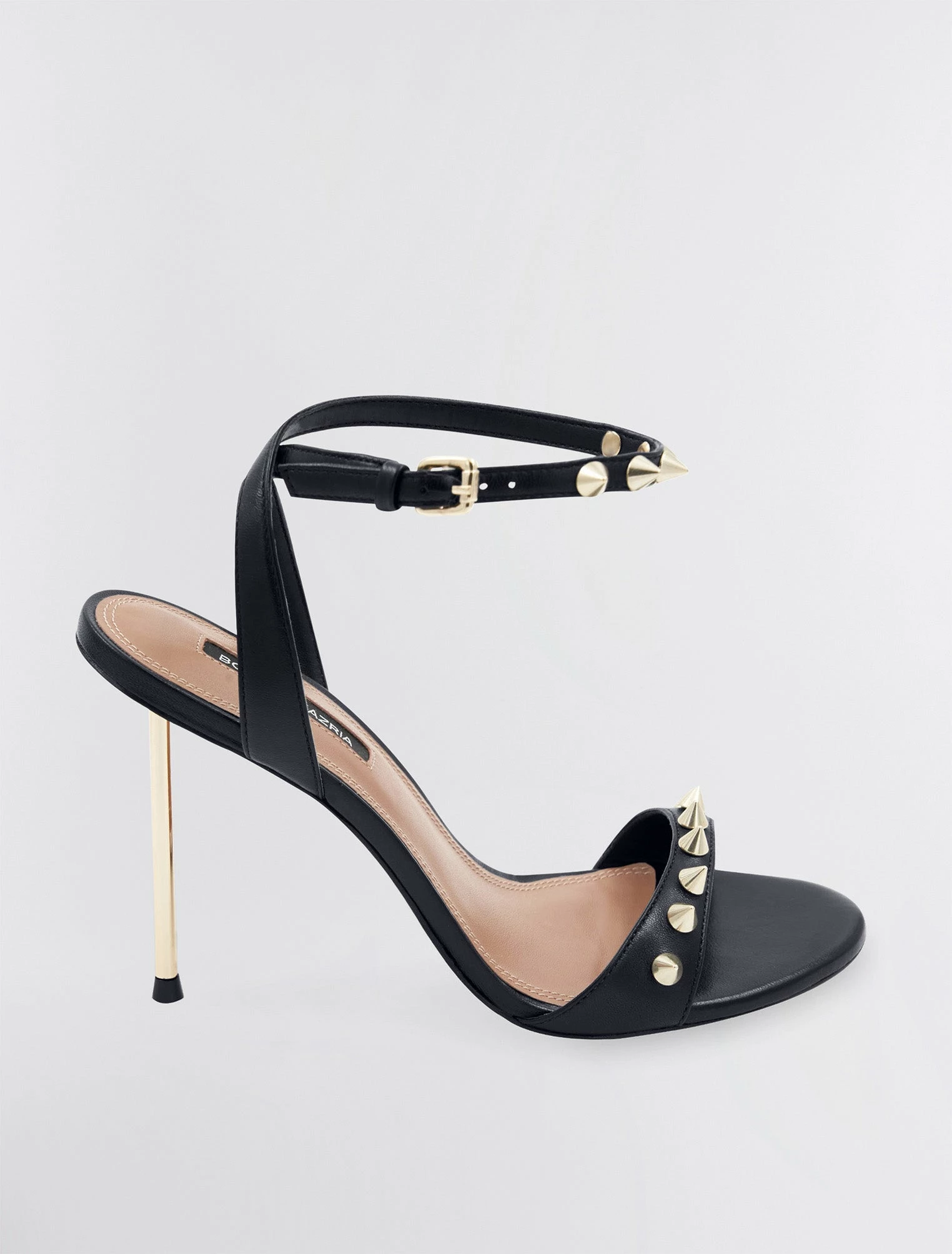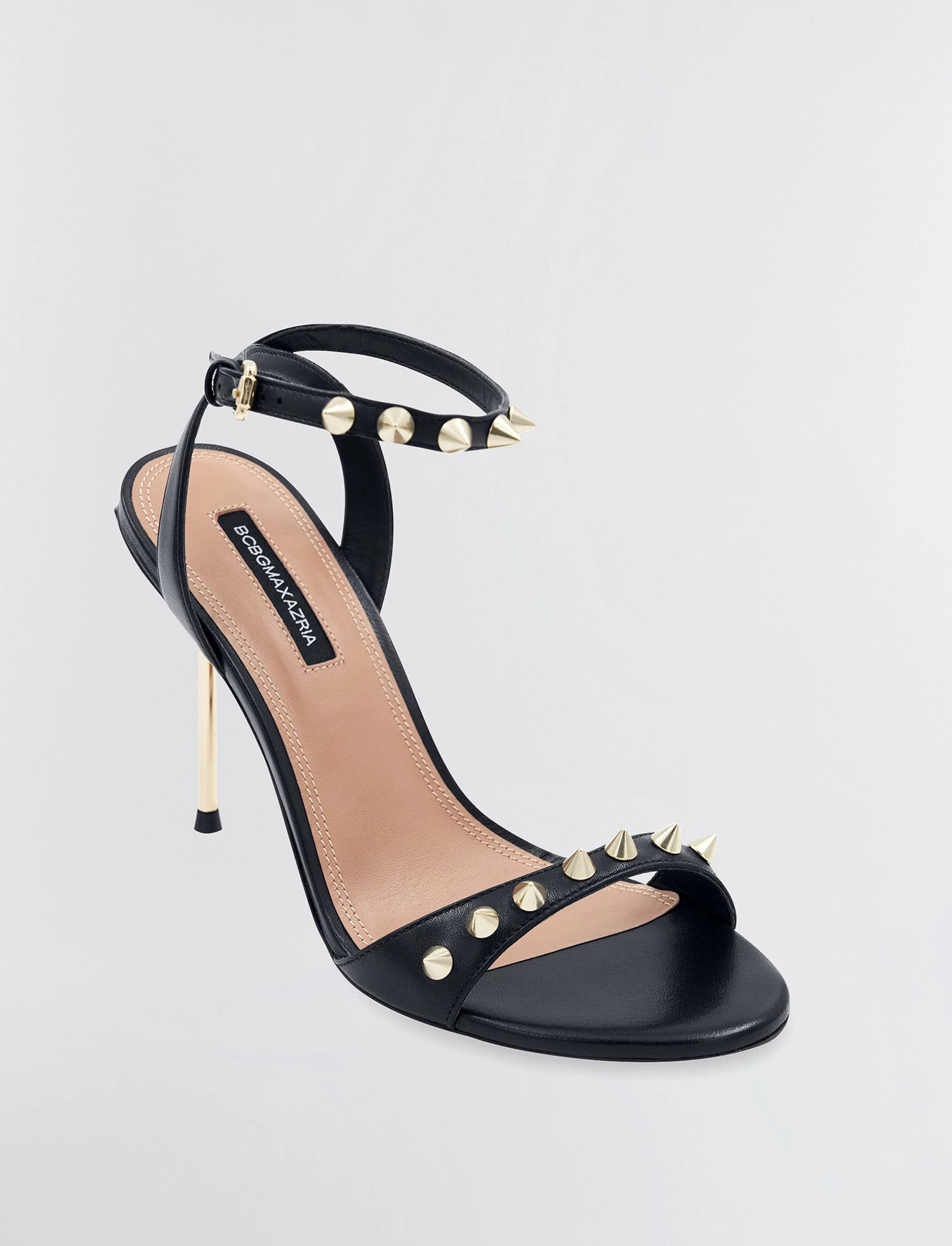 Bold two-strap sandal cut from leather. Embellished with pointed studs for a bit of edge. Topped with an adjustable ankle strap and complete with a thin gold-tone stiletto heel.