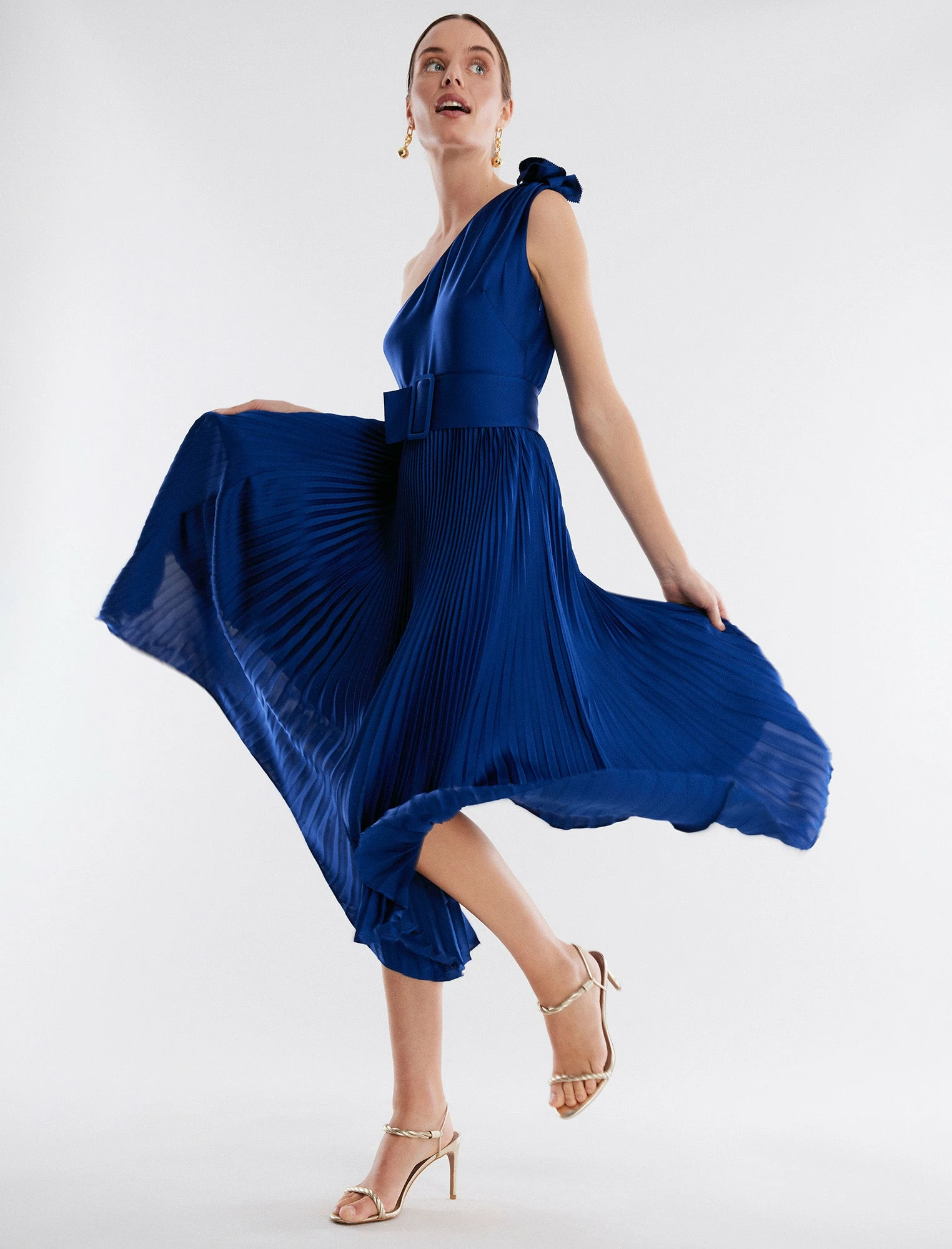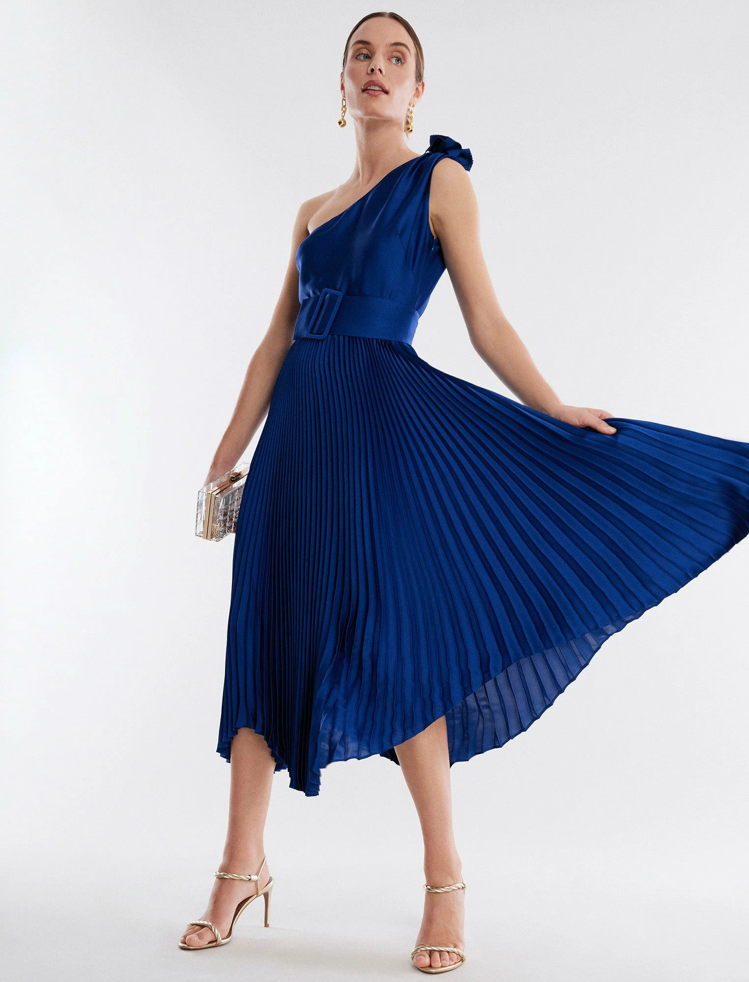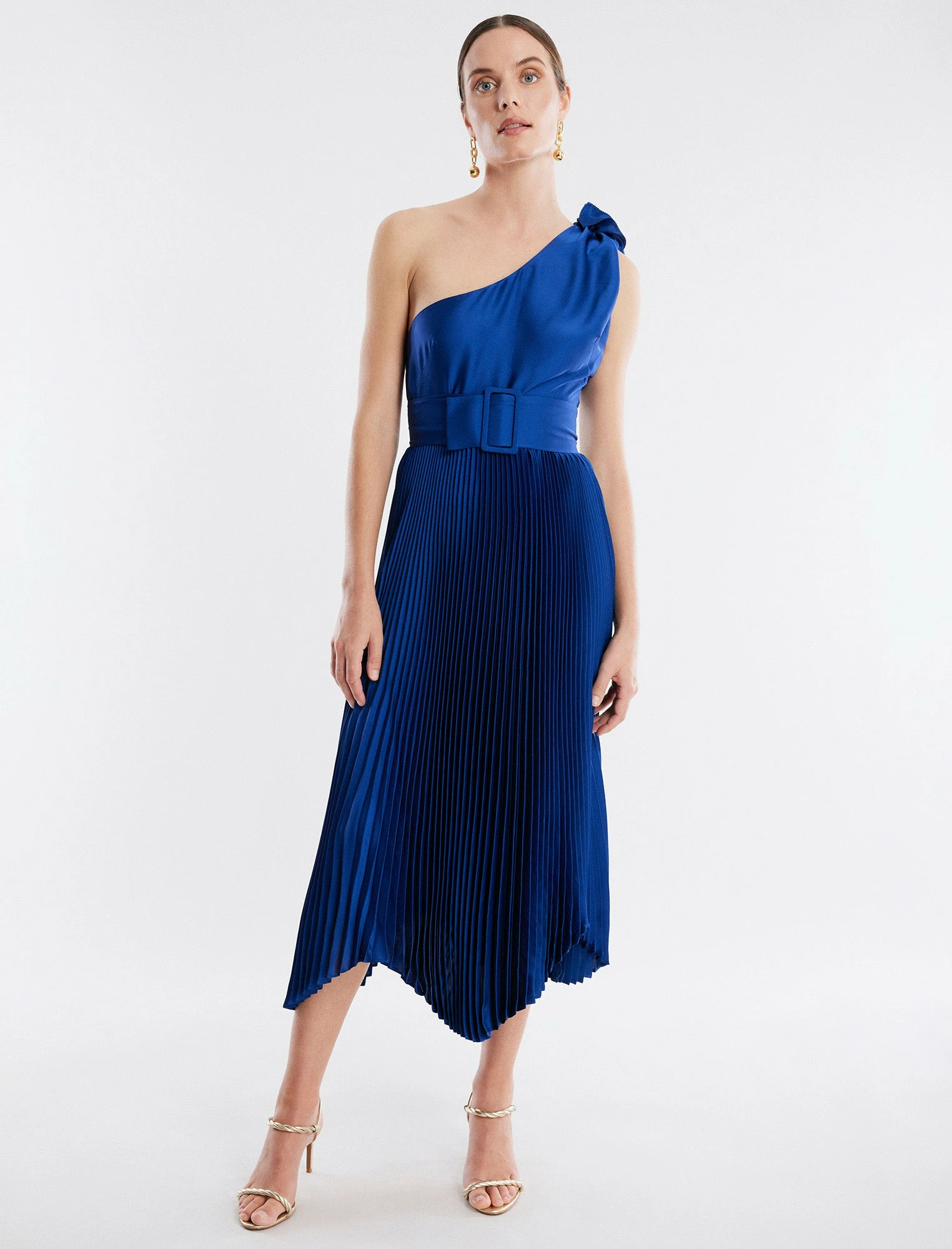 Polished satin midi dress with a smooth bodice and pleated skirt. Designed in a gathered one shoulder silhouette. Cinched with a belted waist and finished with a handkerchief hem and a hidden side zip.