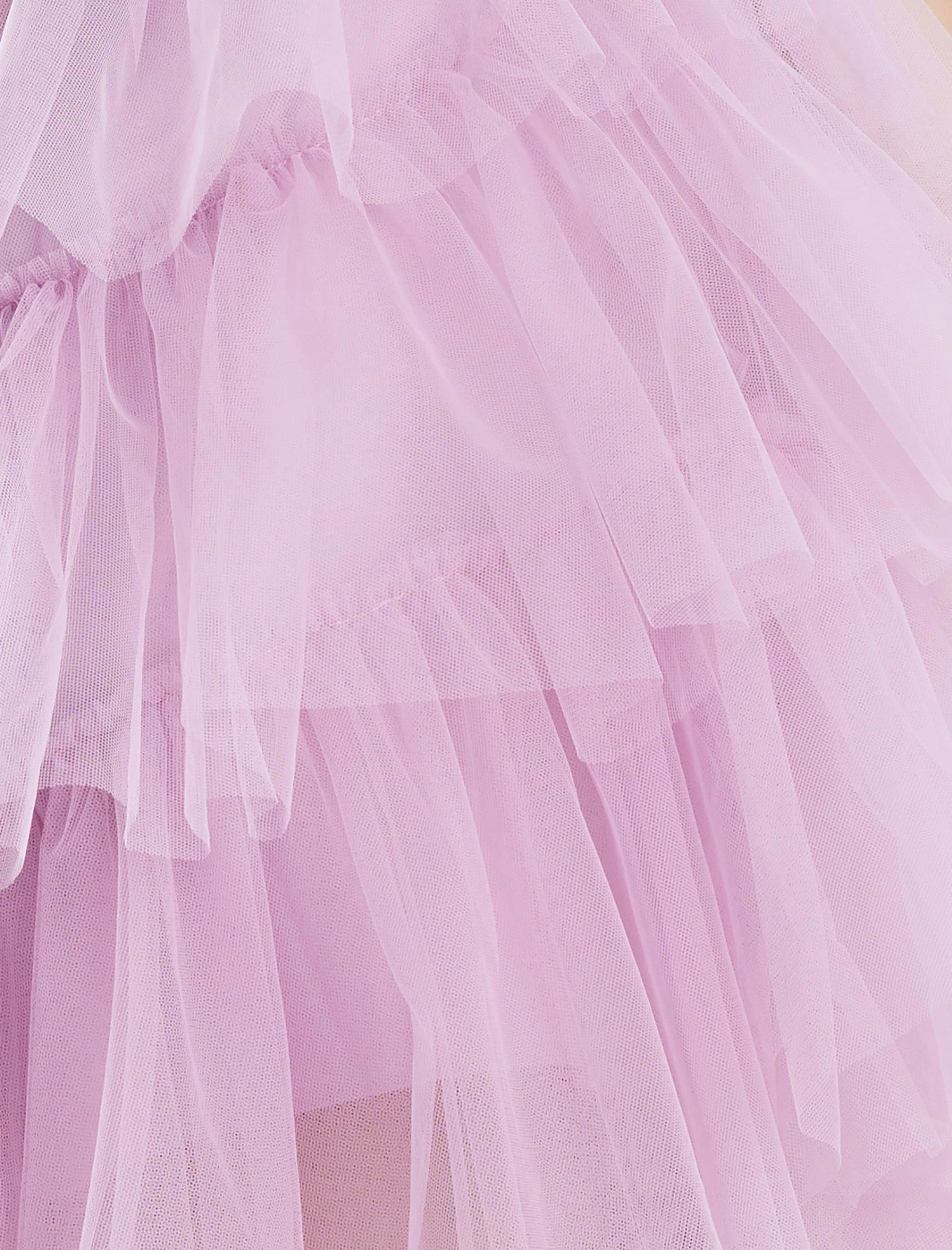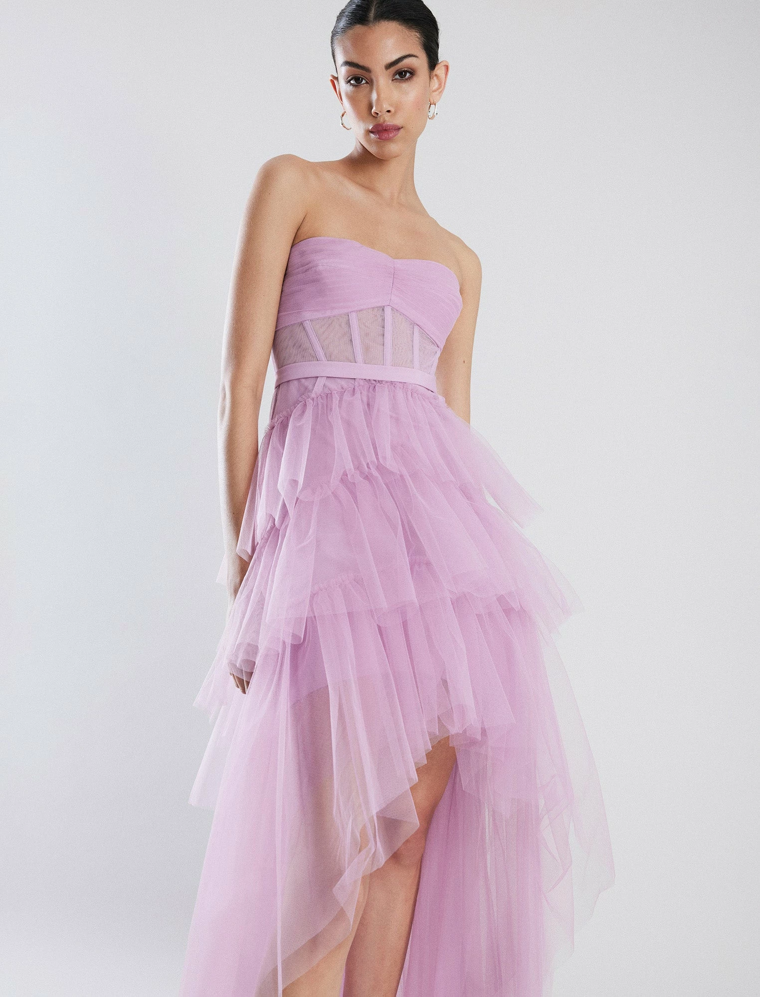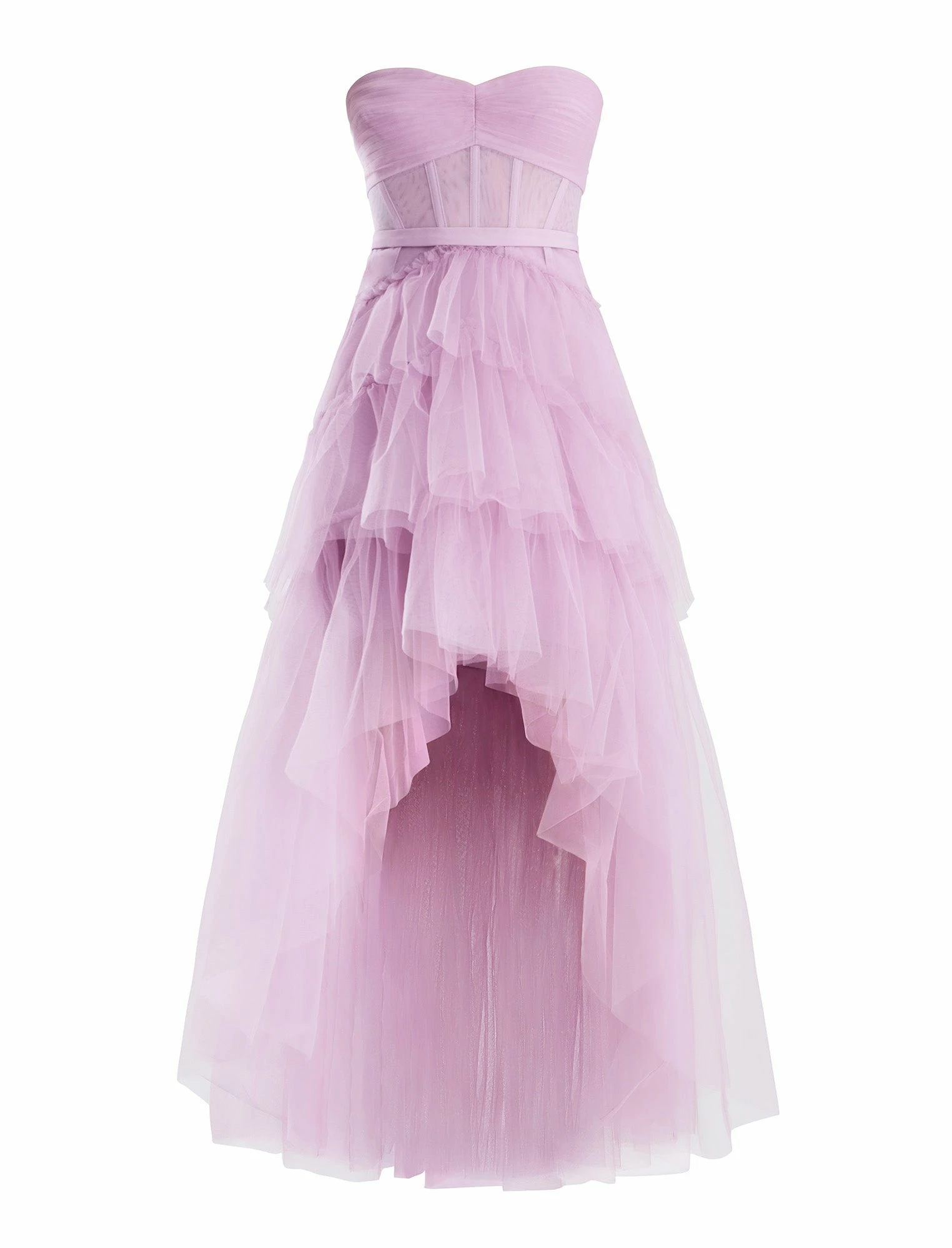 Ethereal purple strapless gown with a romantic mood. Cut entirely from dreamy tulle with a semi sheer corset bodice. Done with a sweetheart neckline in a fit-and-flare silhouette. Finished with a tiered ruffle skirt that’s cut with a stunning high-low hem. Features a hidden back zip.