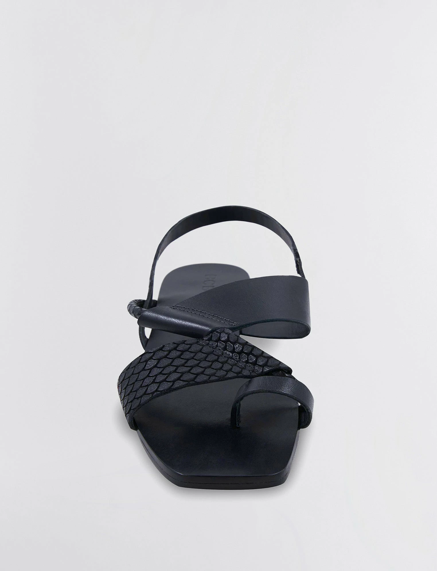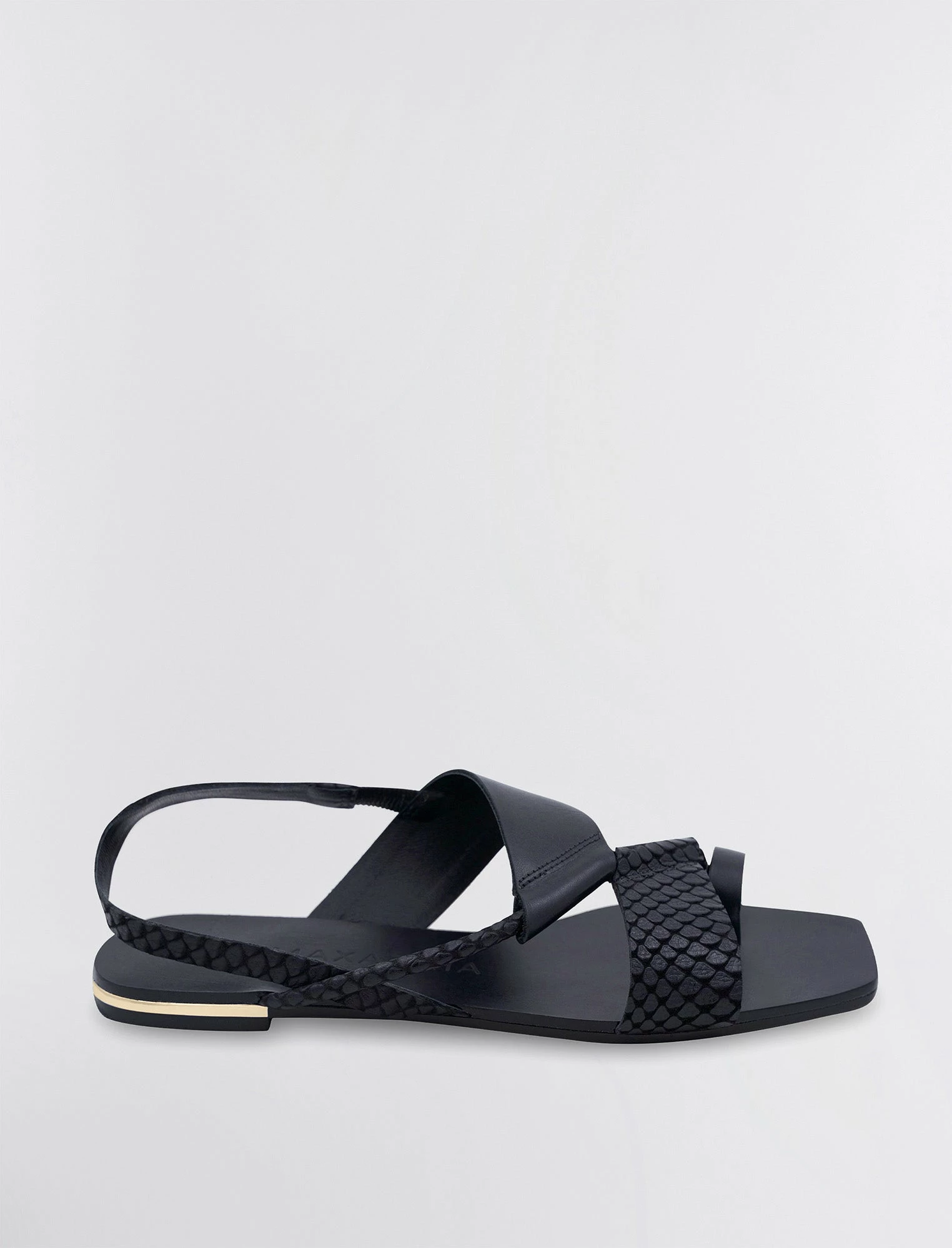 Chic flat sandal in an open square toe silhouette. Crafted from smooth and embossed leather. Designed with a toe loop, a wide toe strap and a stretch slingback heel strap for a secure fit. These women’s sandals are perfect for weekends and vacations.