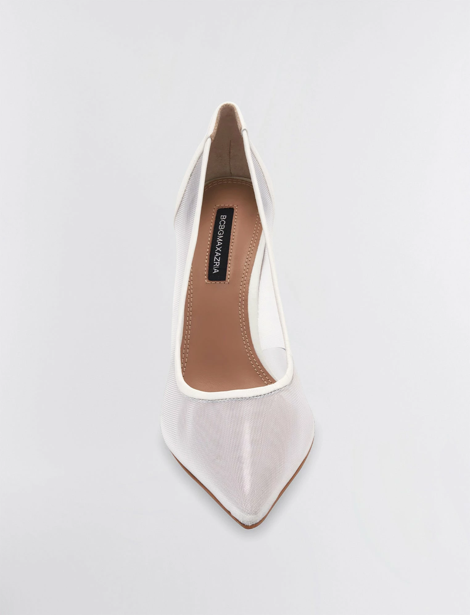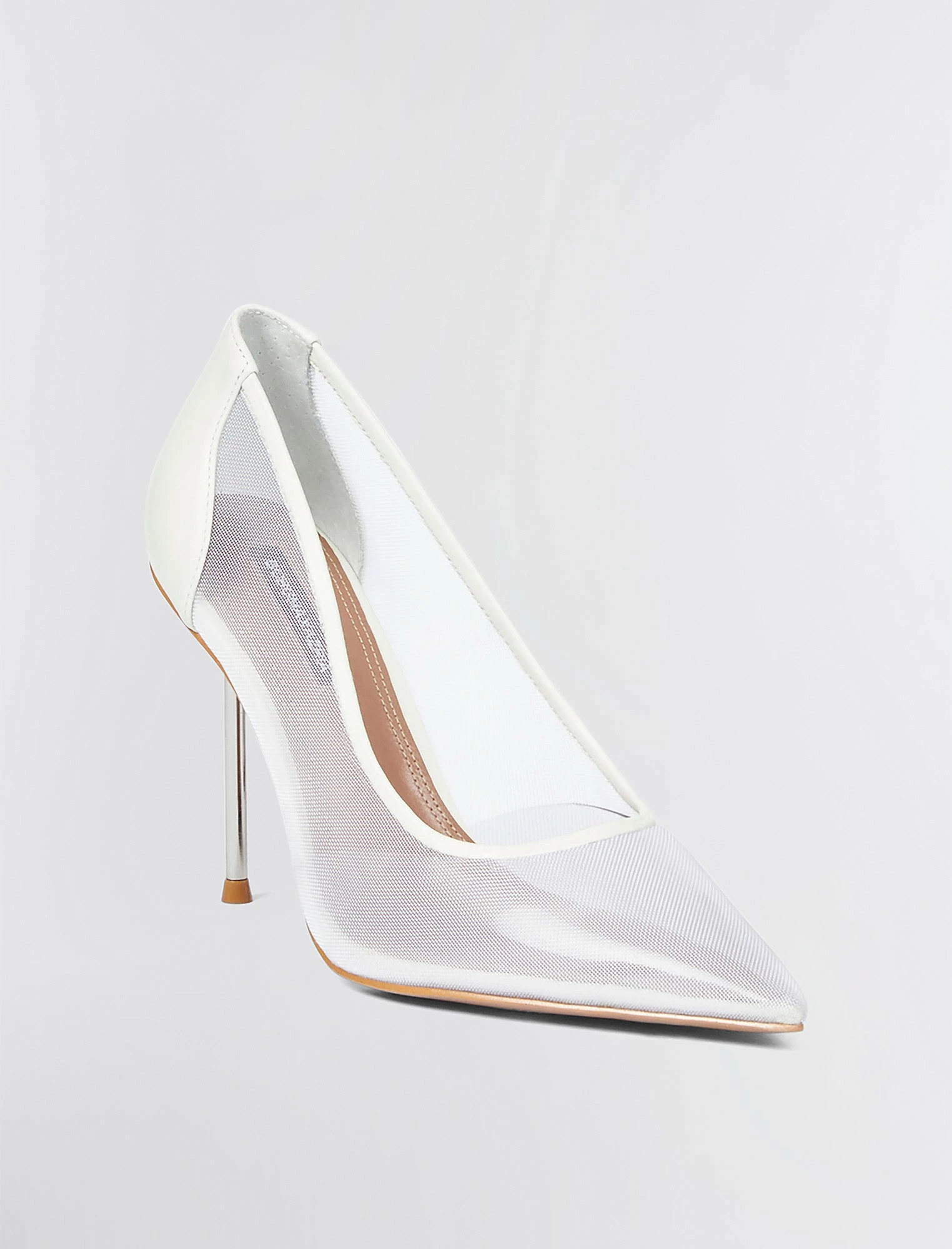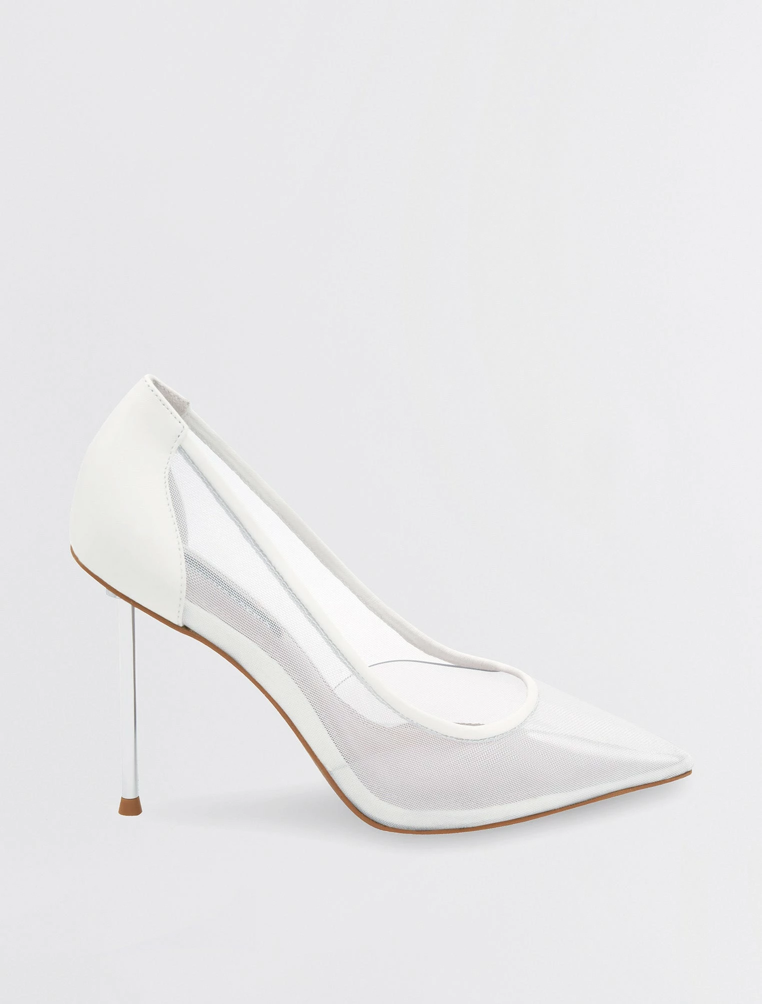 Striking pump with just enough edge. Cut from sheer mesh and smooth leather. Crafted in a pointed toe slip-on design with a thin metal stiletto heel.