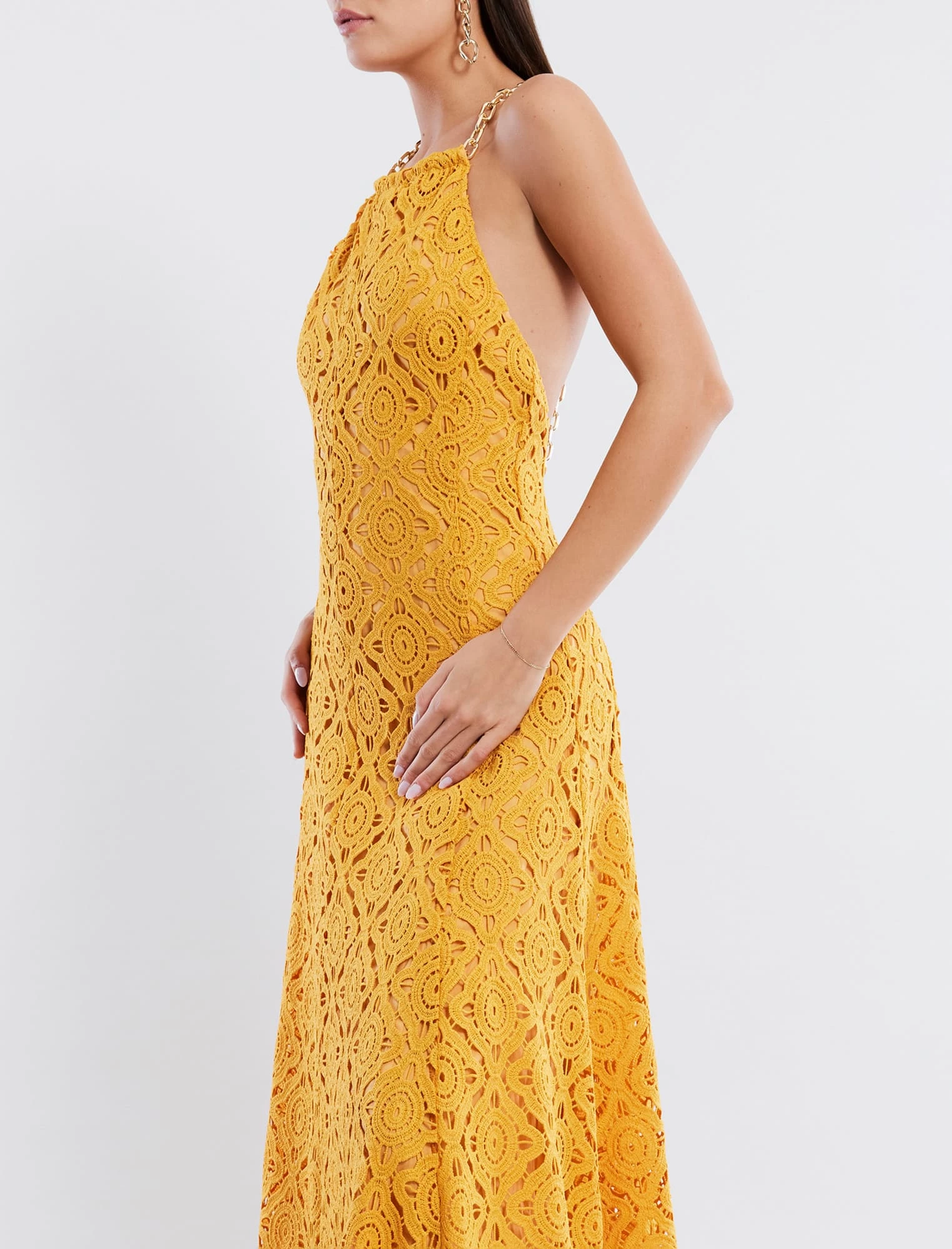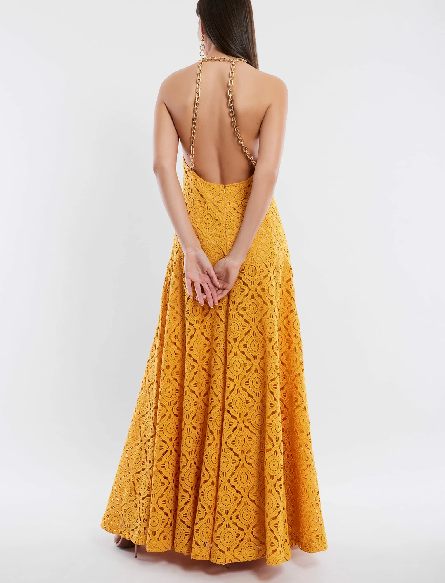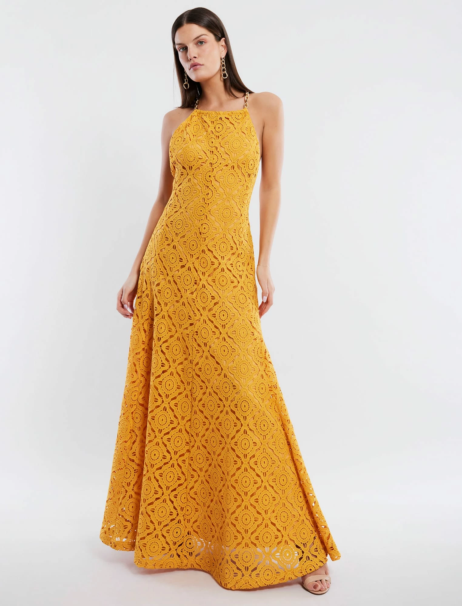 Dreamy full-length halter dress made from sheer eyelet lace with interior lining. Topped with a halter neck and a fully open back with chain straps. Finished with a hidden back zip.