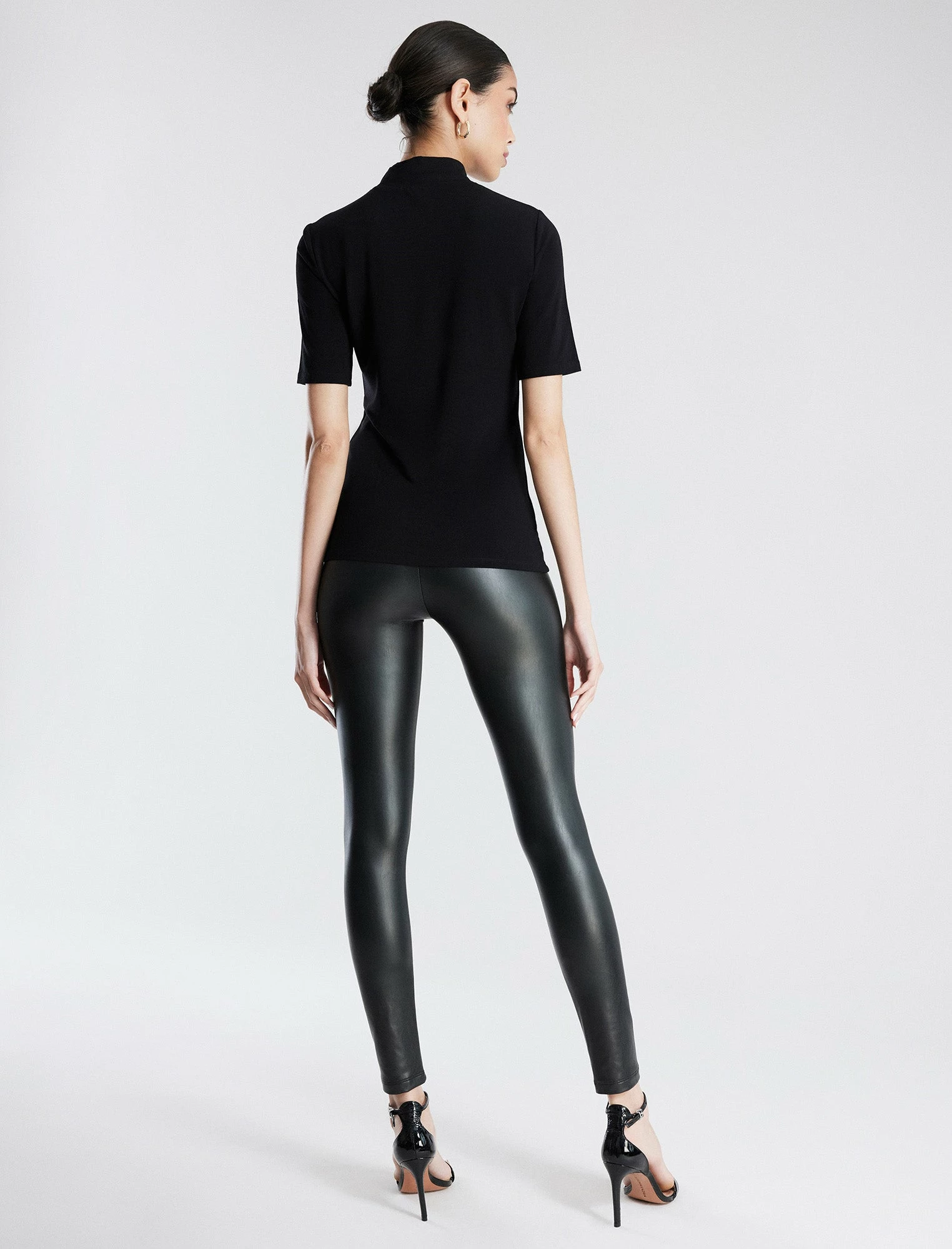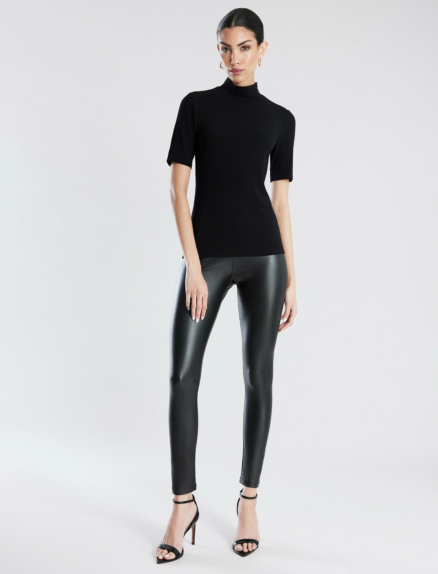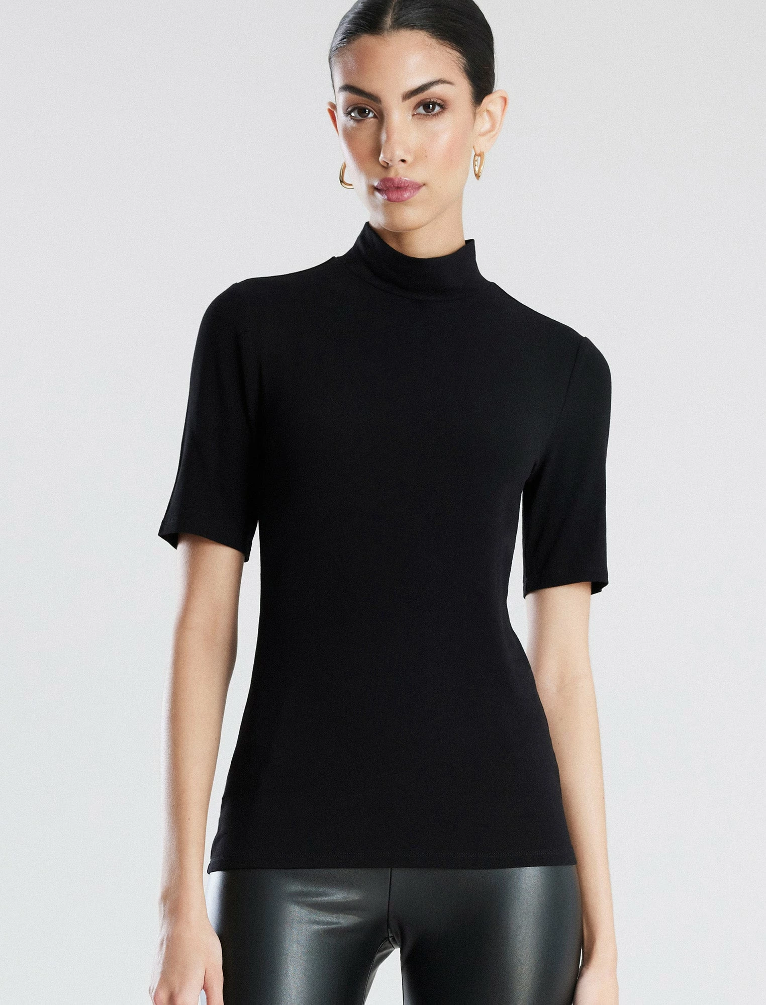 Everyday essential top. Made from sculpted jersey for a form-fitting look that tucks into trousers and skirts. Topped with a mock neck and short sleeves. Done in a pullover design that hits at the natural waist.