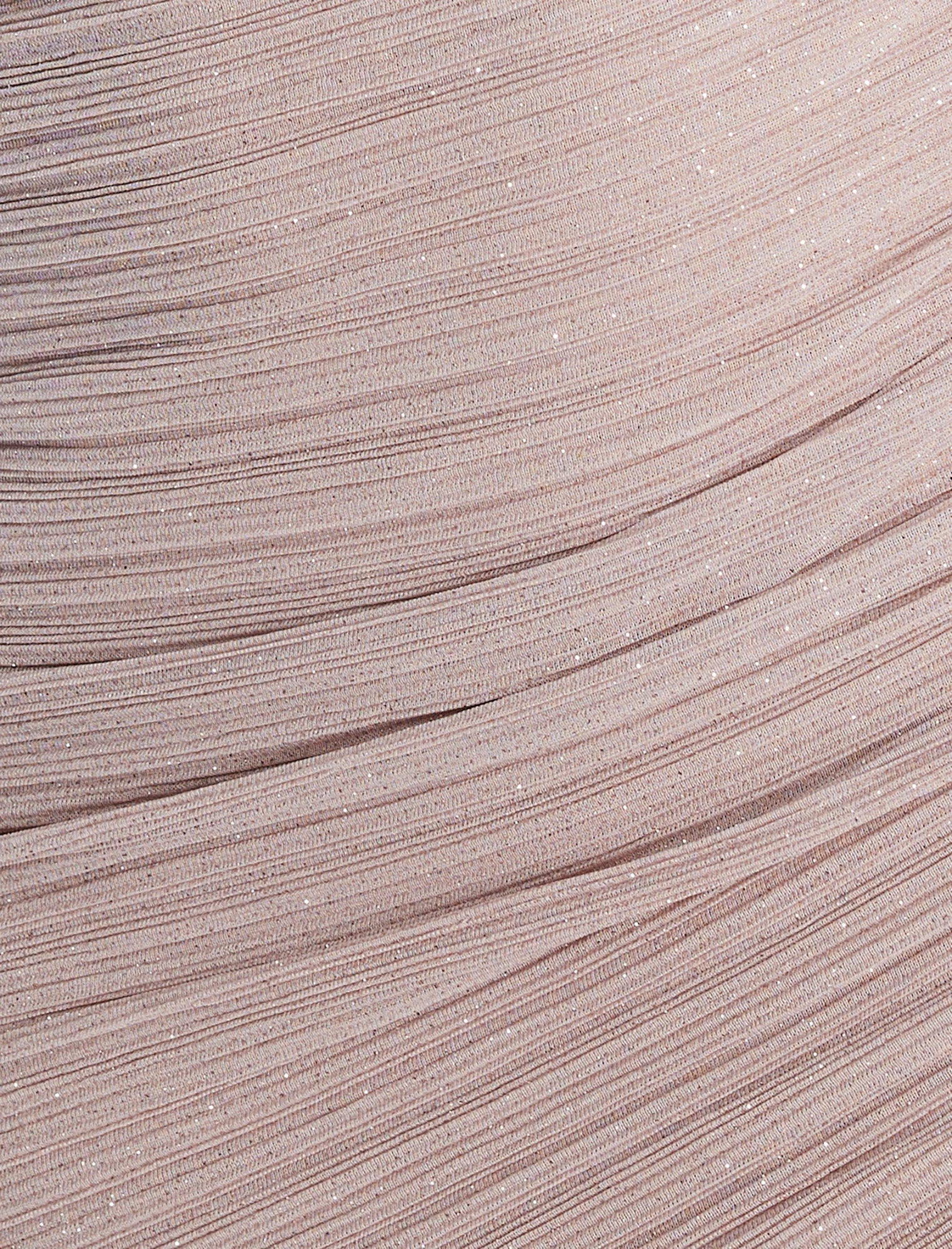 Shimmering nude mini dress made from a glitter crinkle knit for a sparkling finish. Done in a bodycon faux wrap design for a flattering shape. Crafted with a surplice V-neck topped with a bow accent at the shoulders. Finished with a secured back zip.