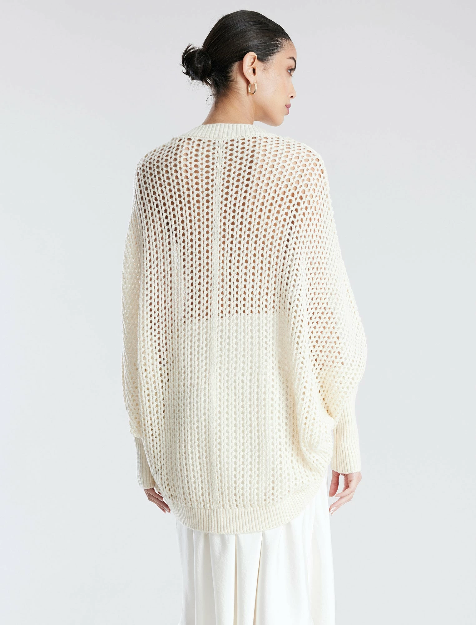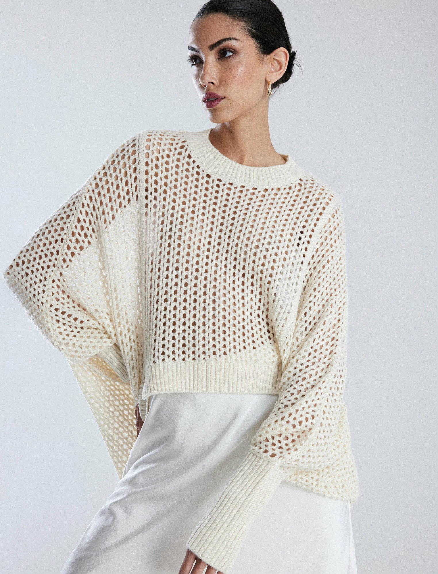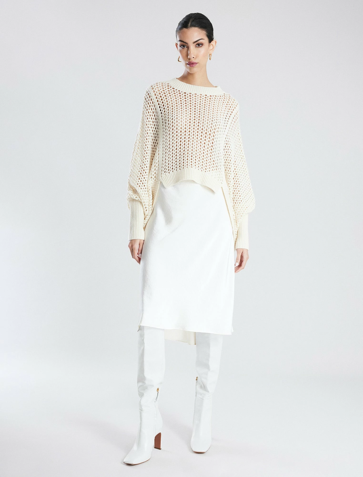 Oversized cocoon pullover sweater done from a sheer open weave knit in a relaxed roomy fit. Topped with a high crew neck and dramatic dolman sleeves with elongated cuffs. Finished with rib trim detailing and a high-low hem.