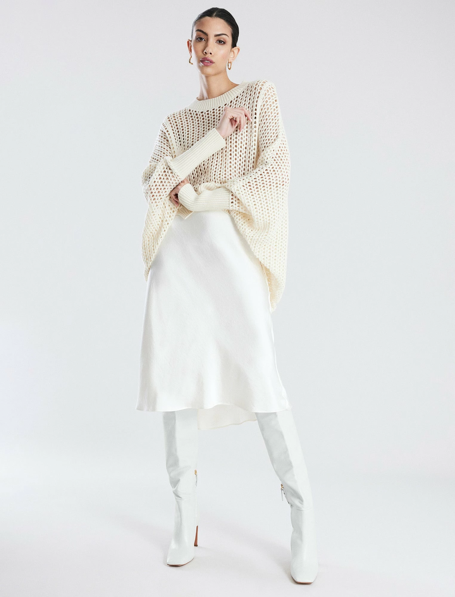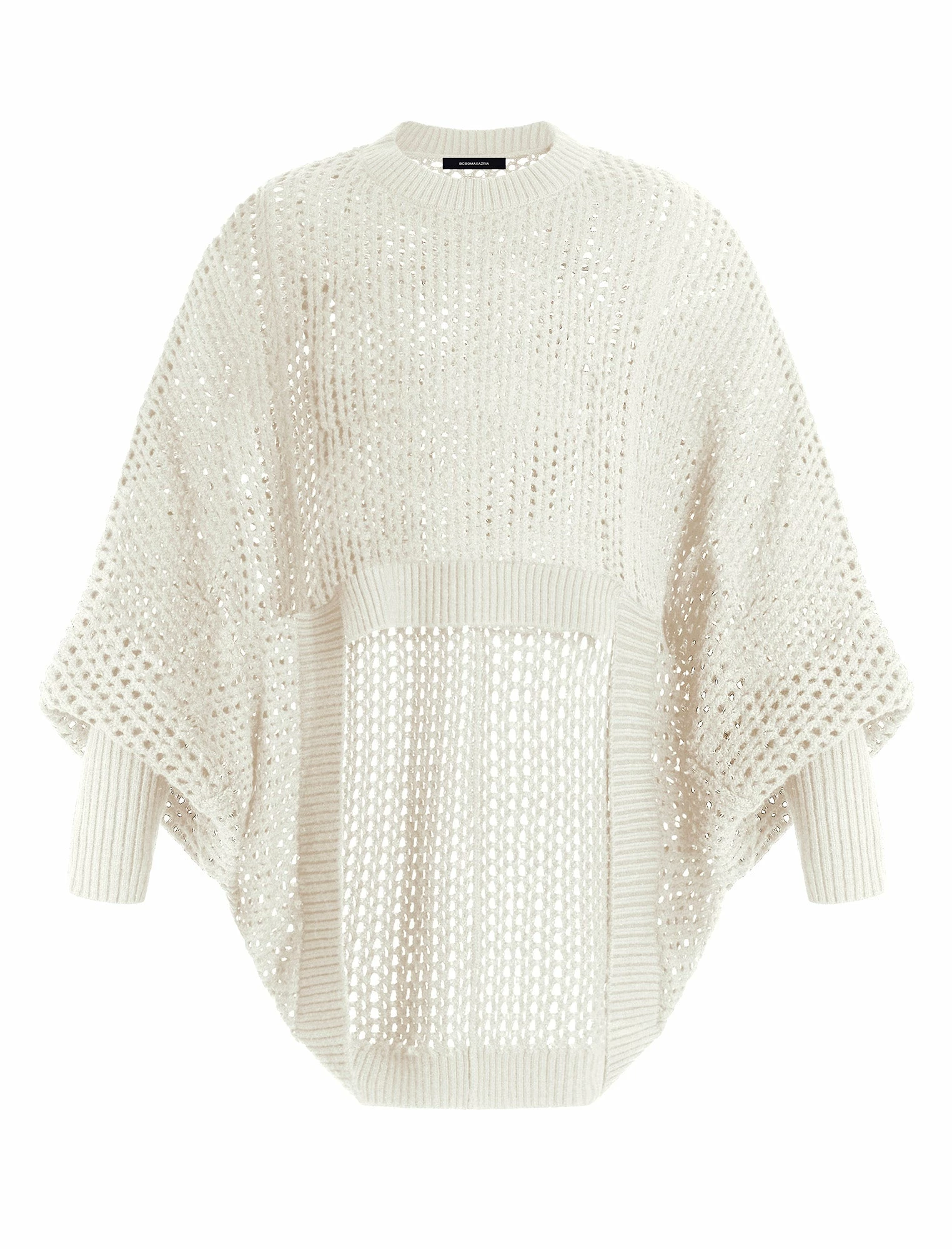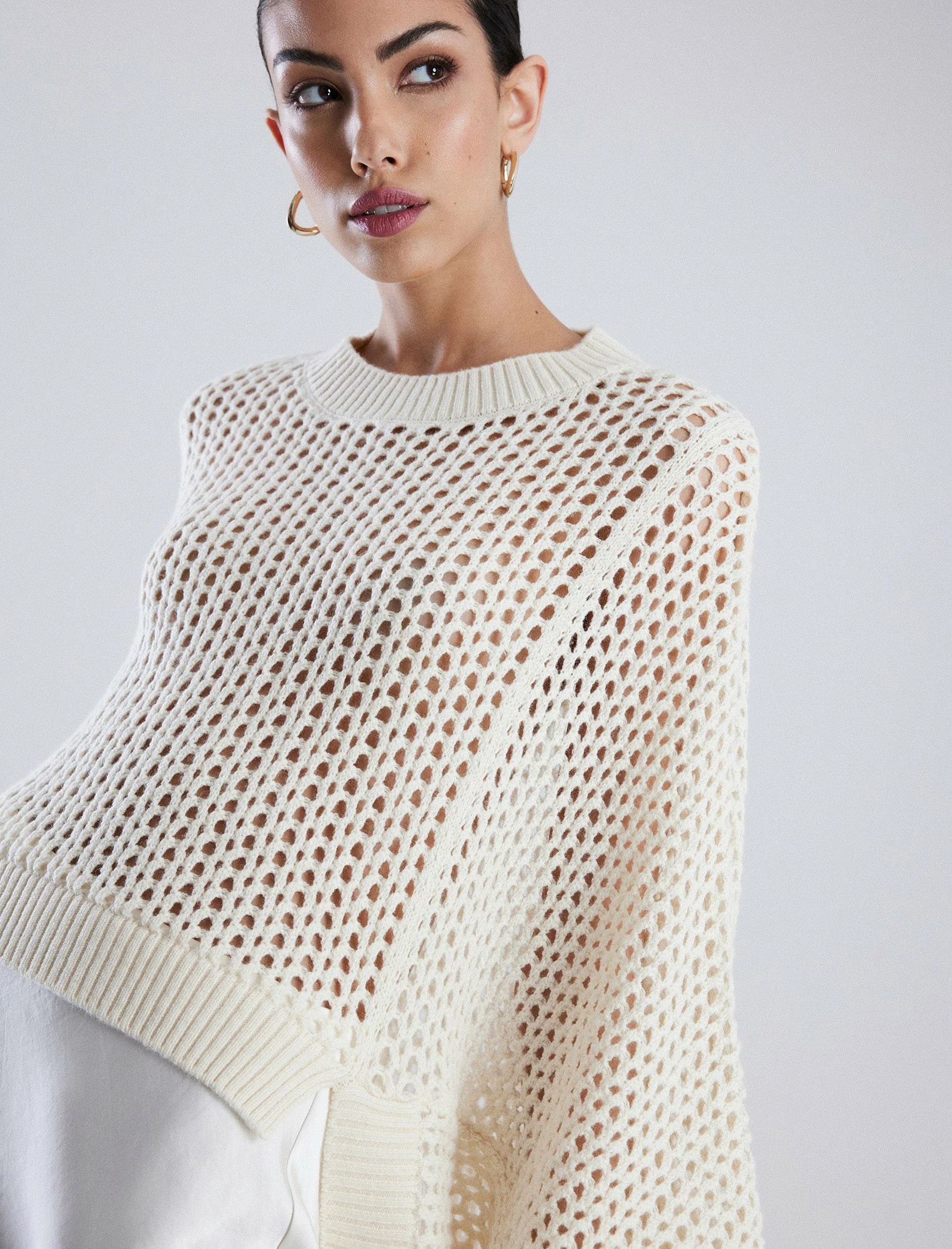 Oversized cocoon pullover sweater done from a sheer open weave knit in a relaxed roomy fit. Topped with a high crew neck and dramatic dolman sleeves with elongated cuffs. Finished with rib trim detailing and a high-low hem.