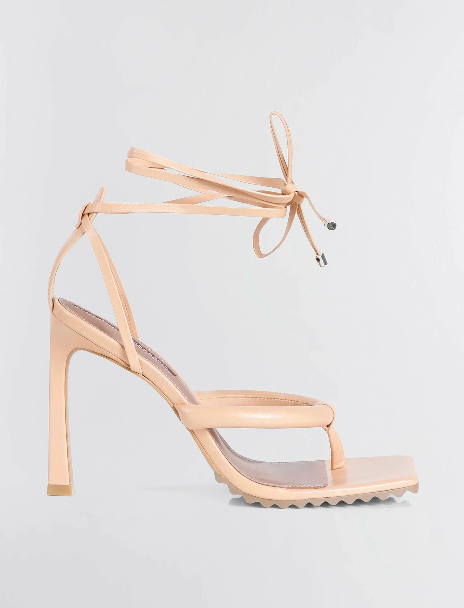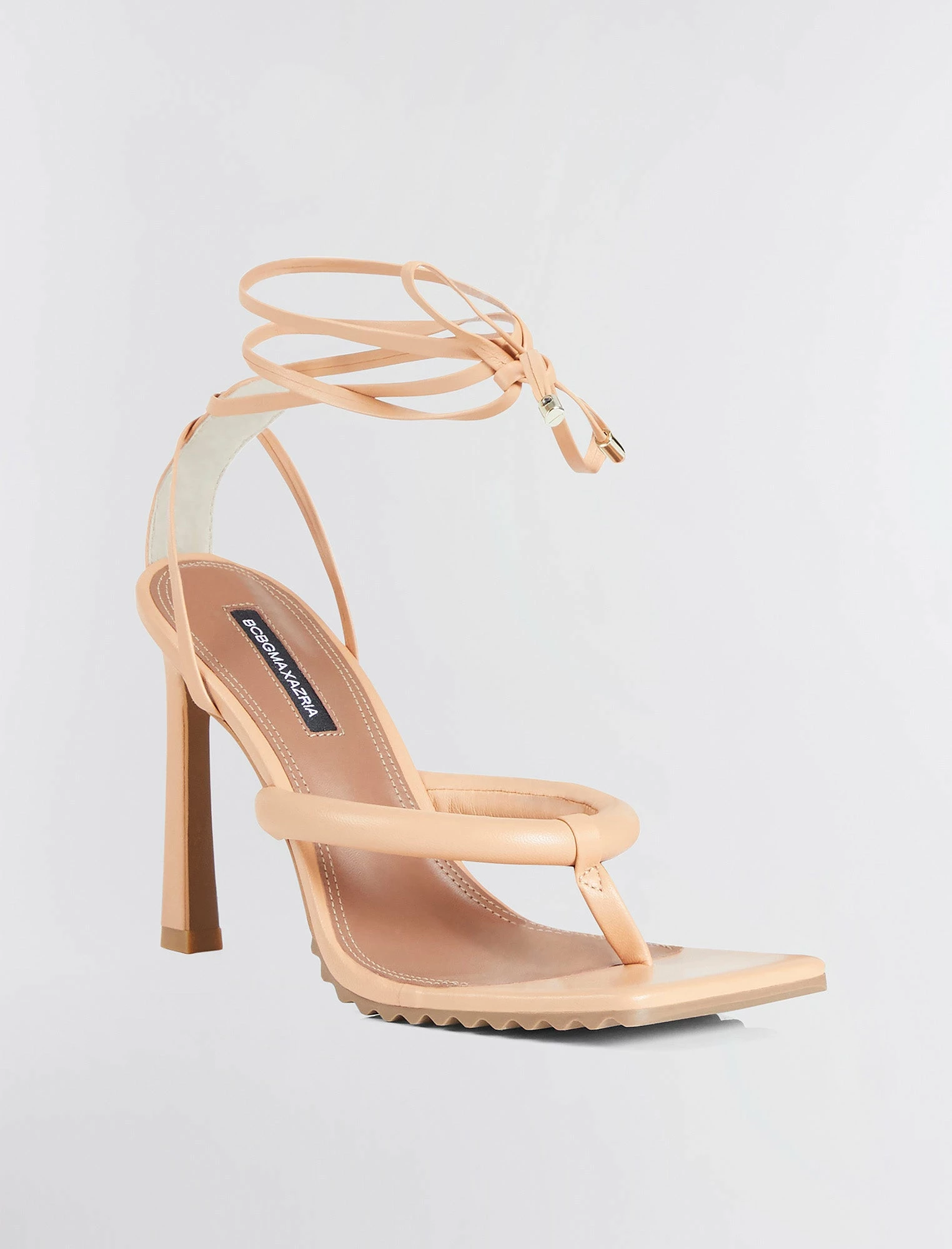 Striking thong sandal with a modern open square toe. Topped with self-tie multi-wrap ankle straps for a showstopping look. Finished with a sturdy stiletto heel.