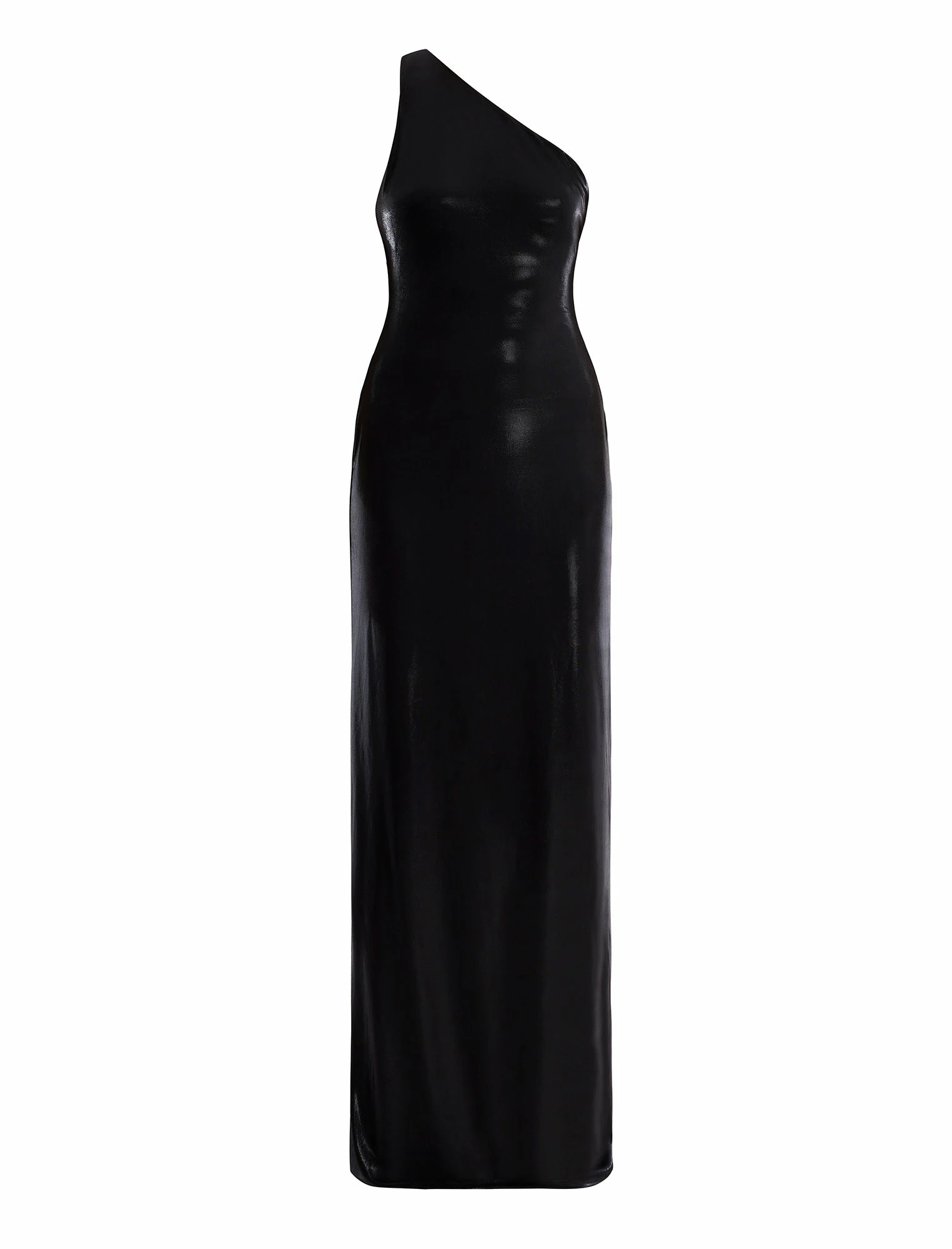 Figure-hugging one shoulder gown crafted from liquid-like jersey with a high-shine finish. Done with an alluring open back and a single asymmetrical strap. Complete with a back vent and a hidden side zip.