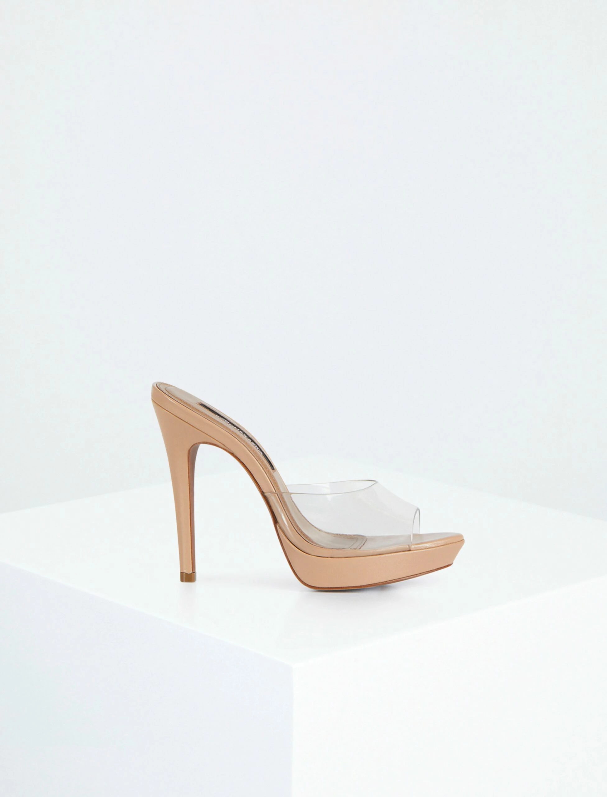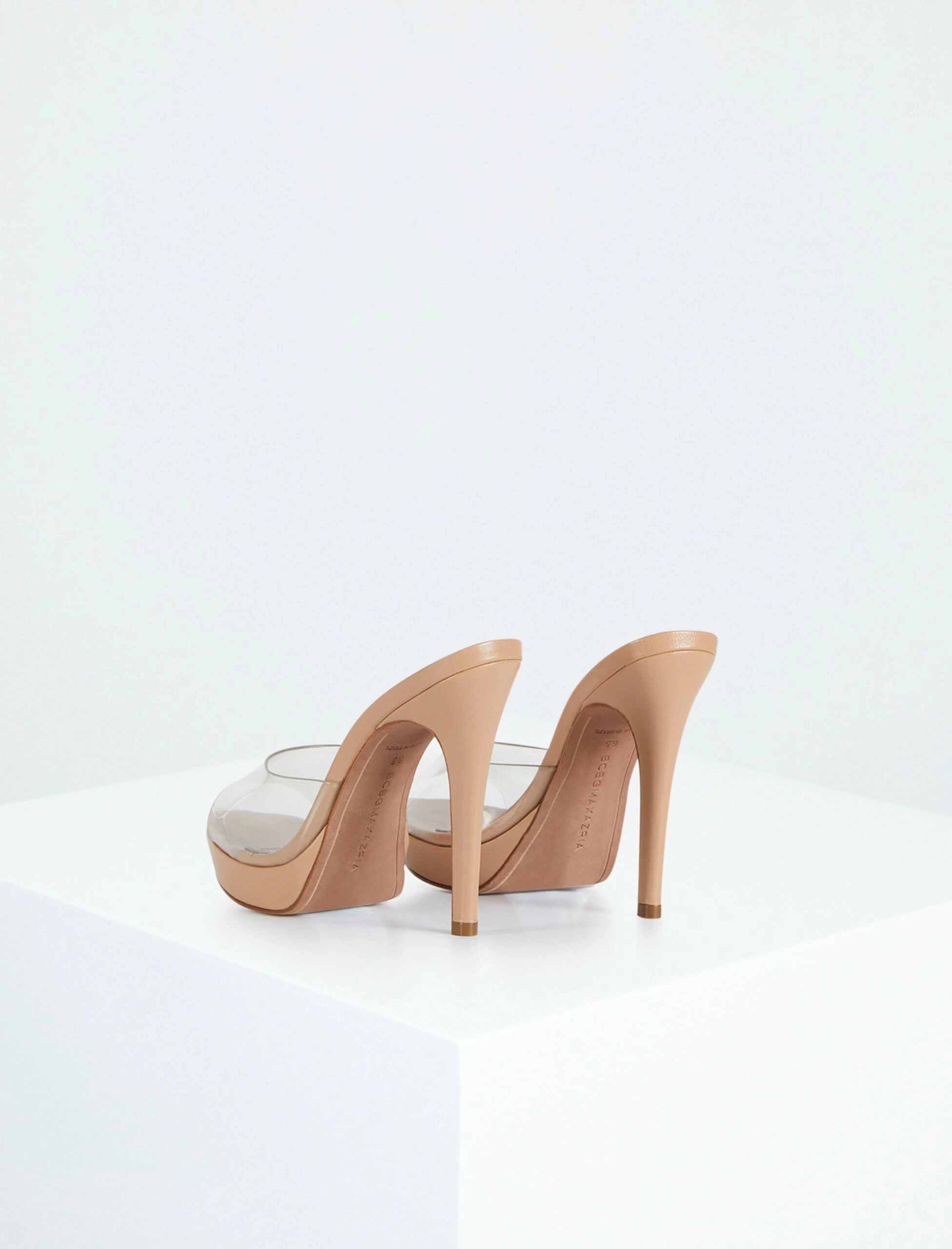 Platform sandal for added height in an effortless slip-on design. Made with a leather insole and a transparent peep toe strap for a minimal look that elongates the leg. Finished with a tall stiletto heel.