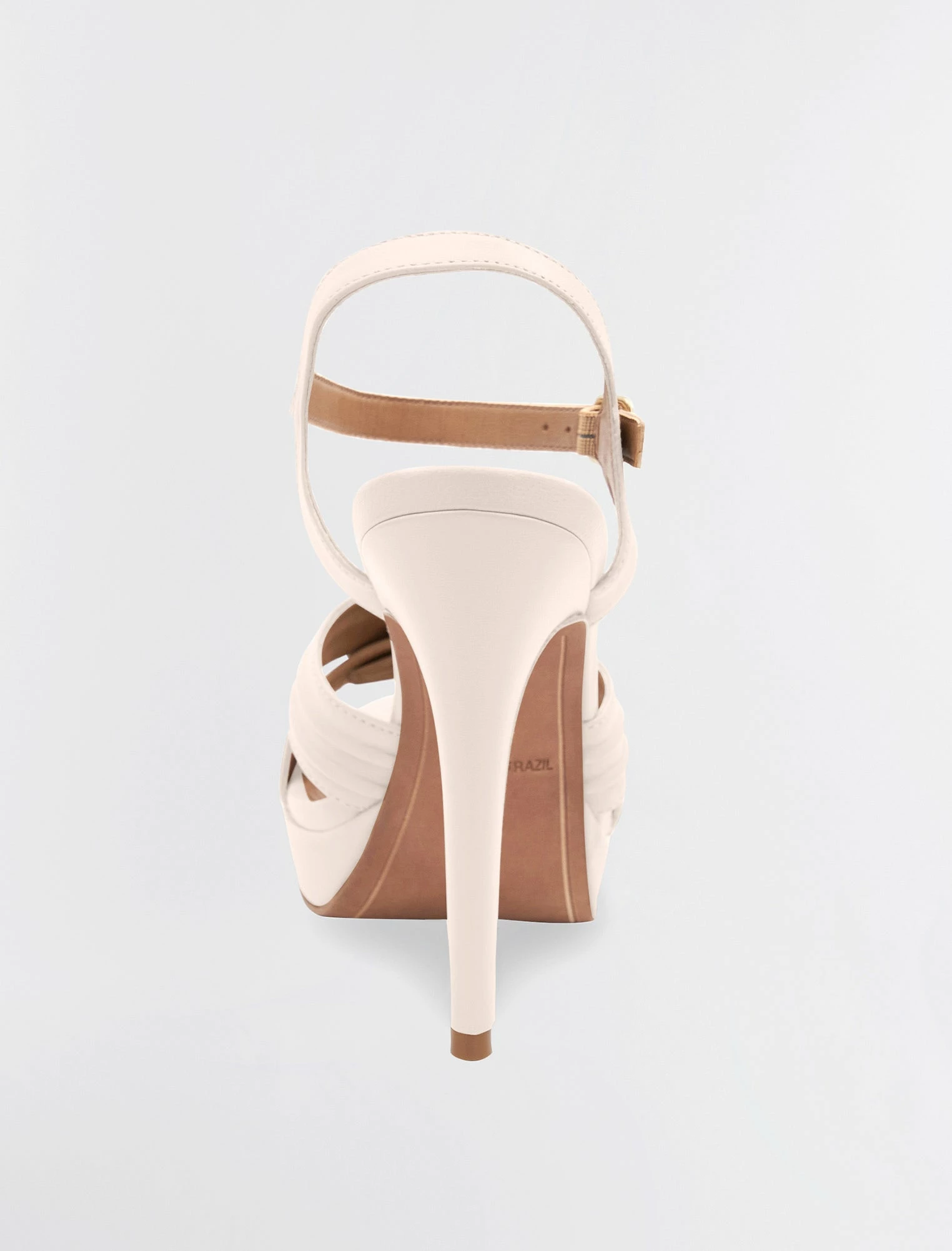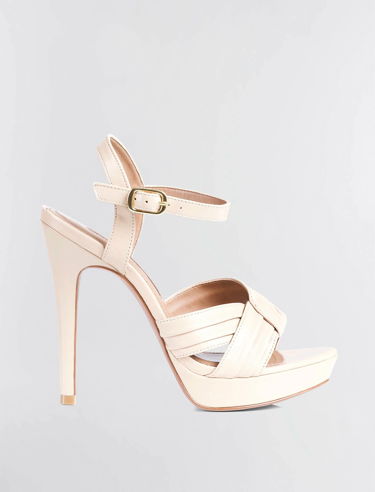 Eye-catching platform heel crafted from leather. Made with an open toe and ruched crossover straps. Topped with a secure buckle ankle strap and finished with a stiletto heel.