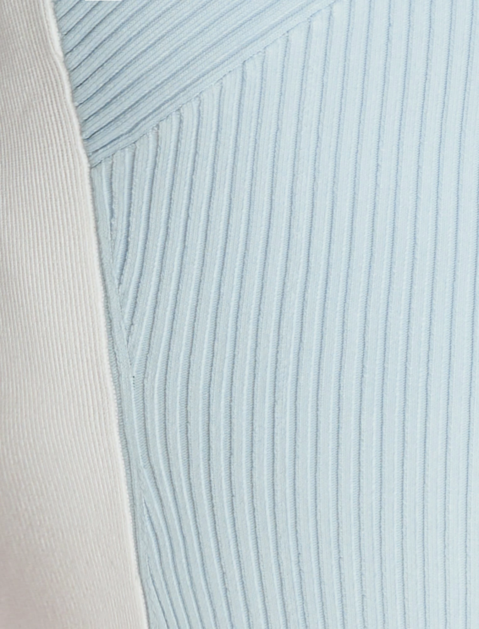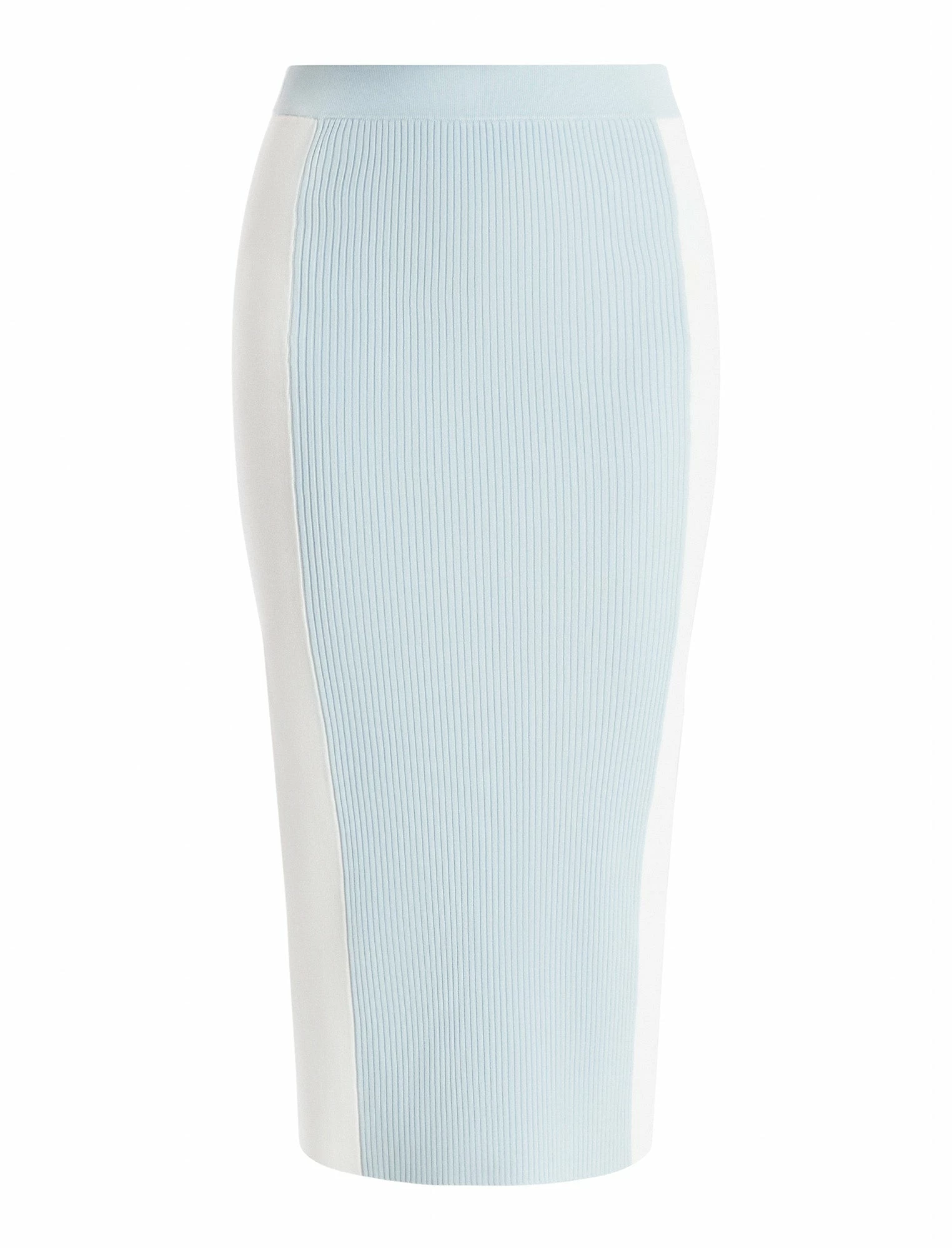 Light blue midi skirt cut from a ribbed stretch knit. Done in a pull-on bodycon design that hugs the frame for a flattering fit. Complete with a back vent.