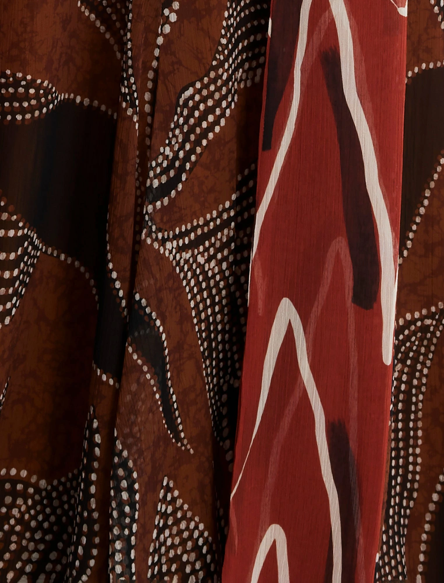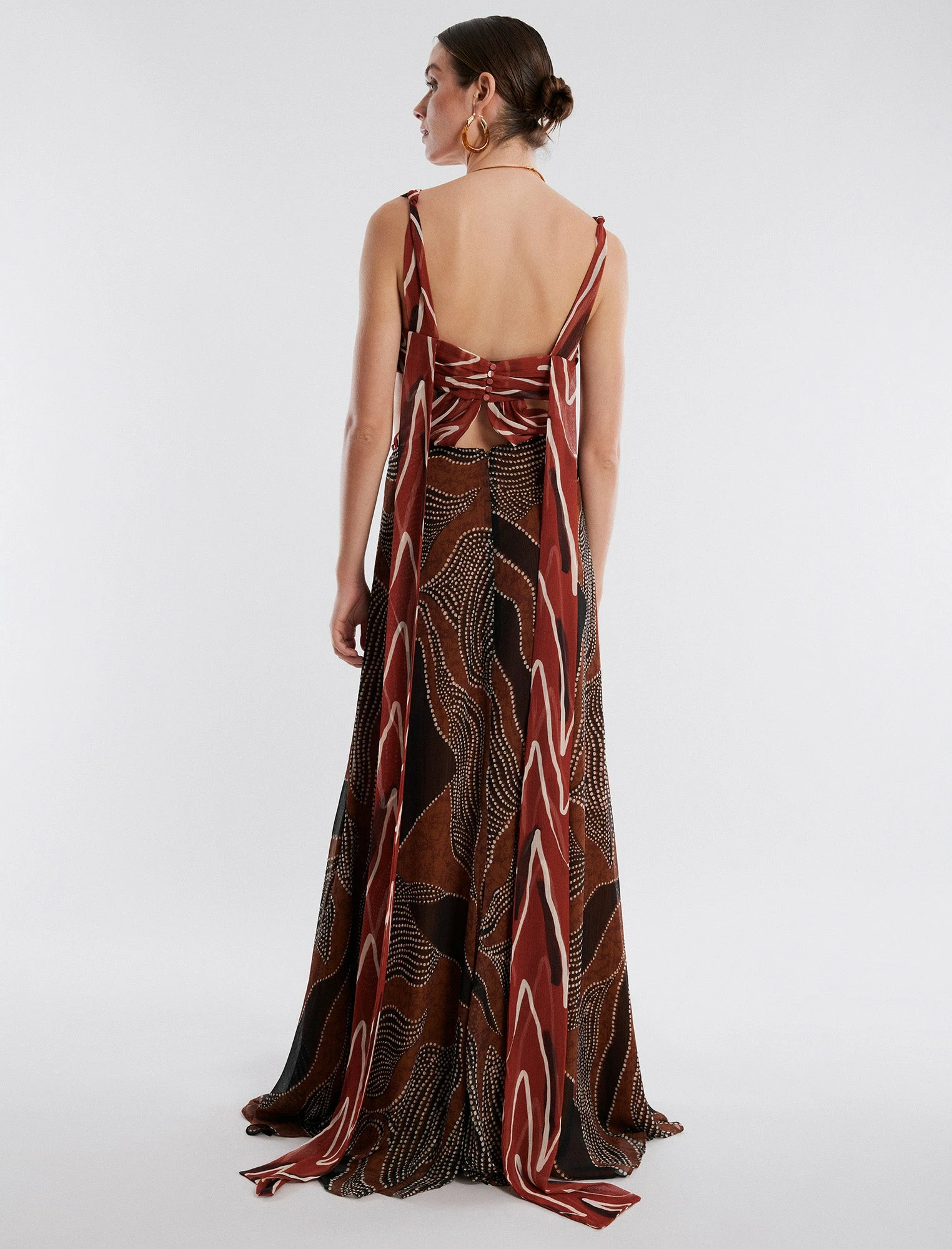 Bold mixed print gown with a sweetheart bust and cutouts. Done with a scarf-inspired bodice that ties at the waist and a flowy skirt that moves with so much ease. Secured with a hidden back zip.