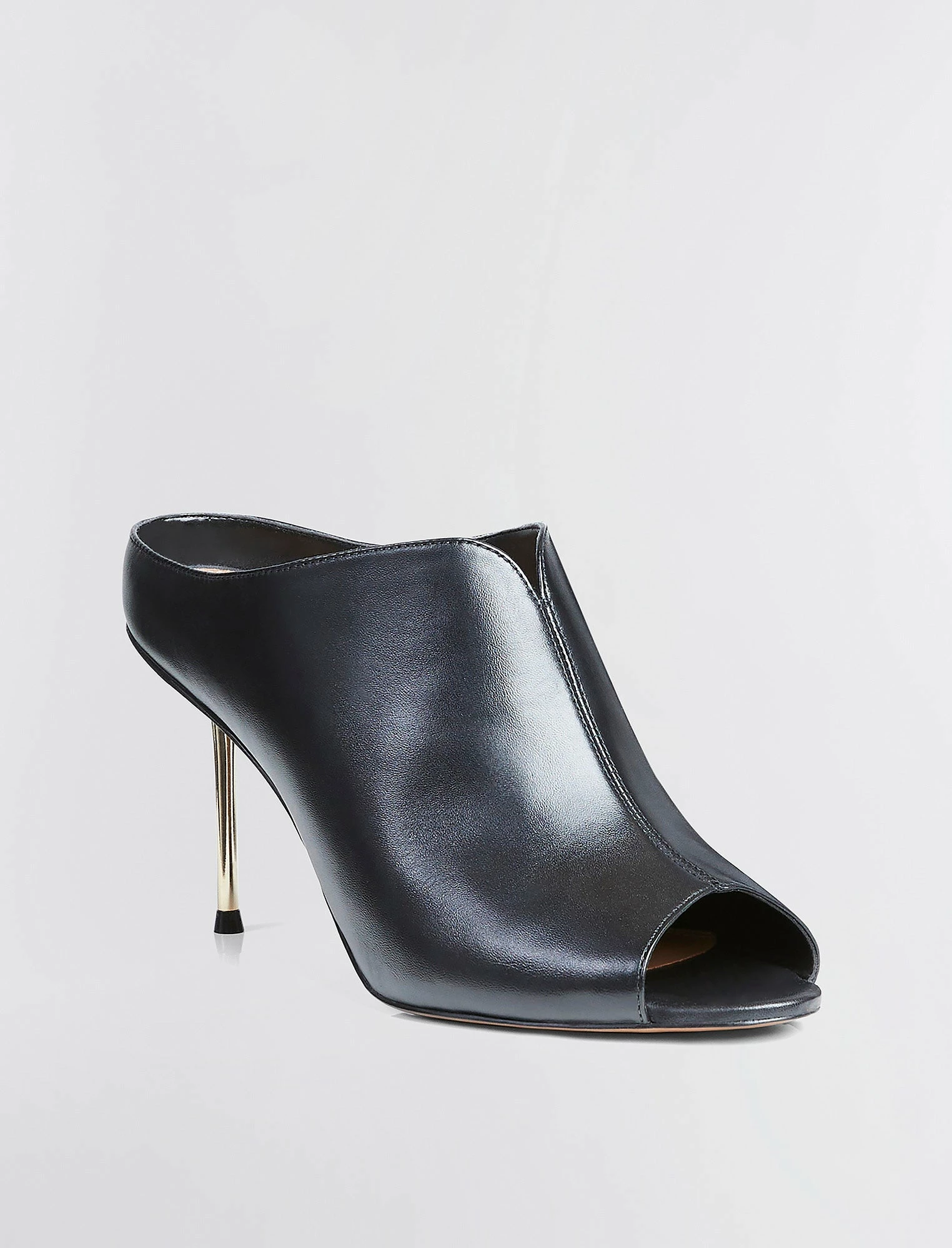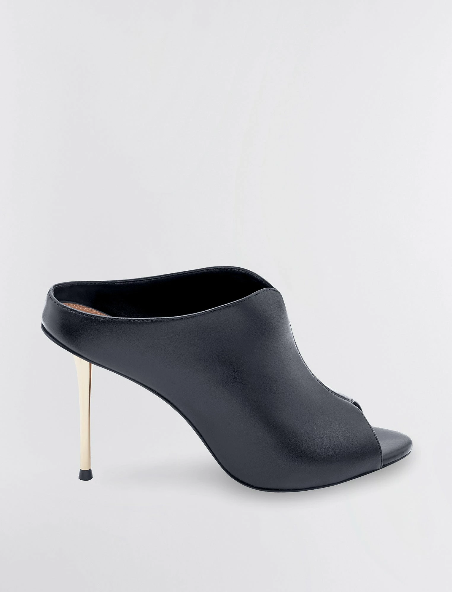 Chic peep toe mule crafted from ultra-smooth leather. Made in a slip-on design with an exposed back. Complete with a thin metallic stiletto heel.