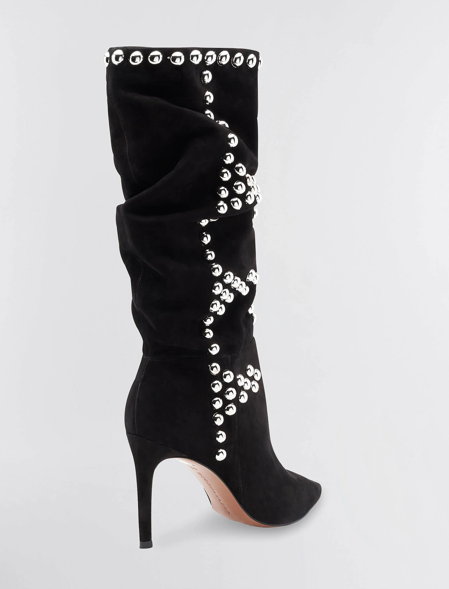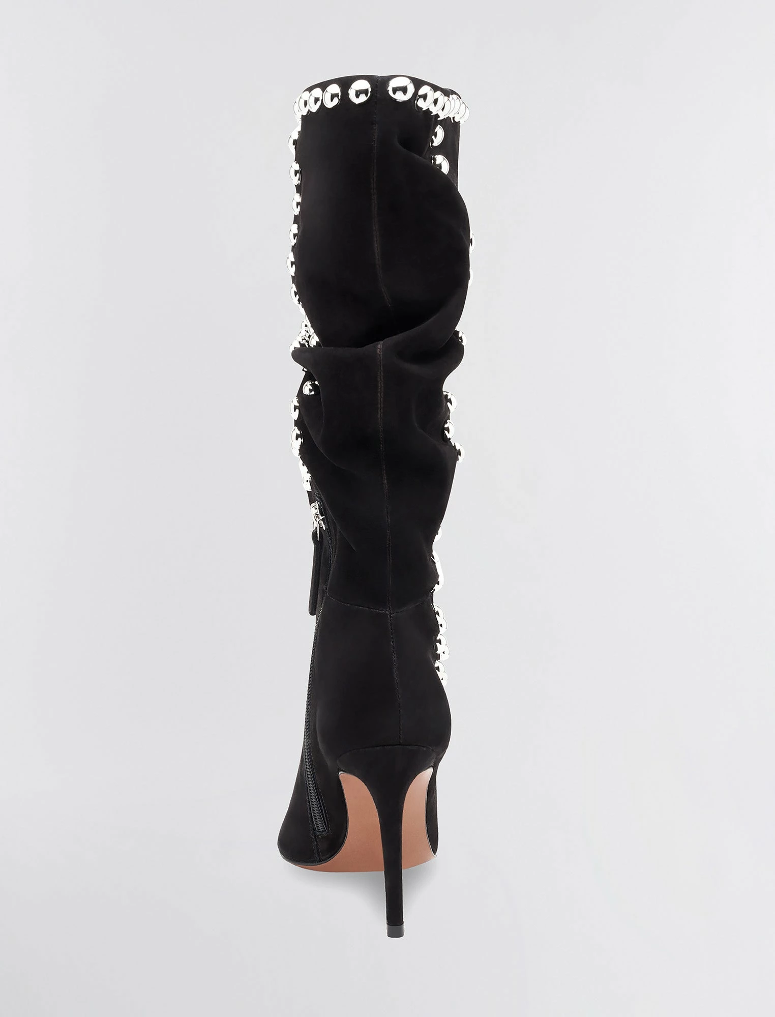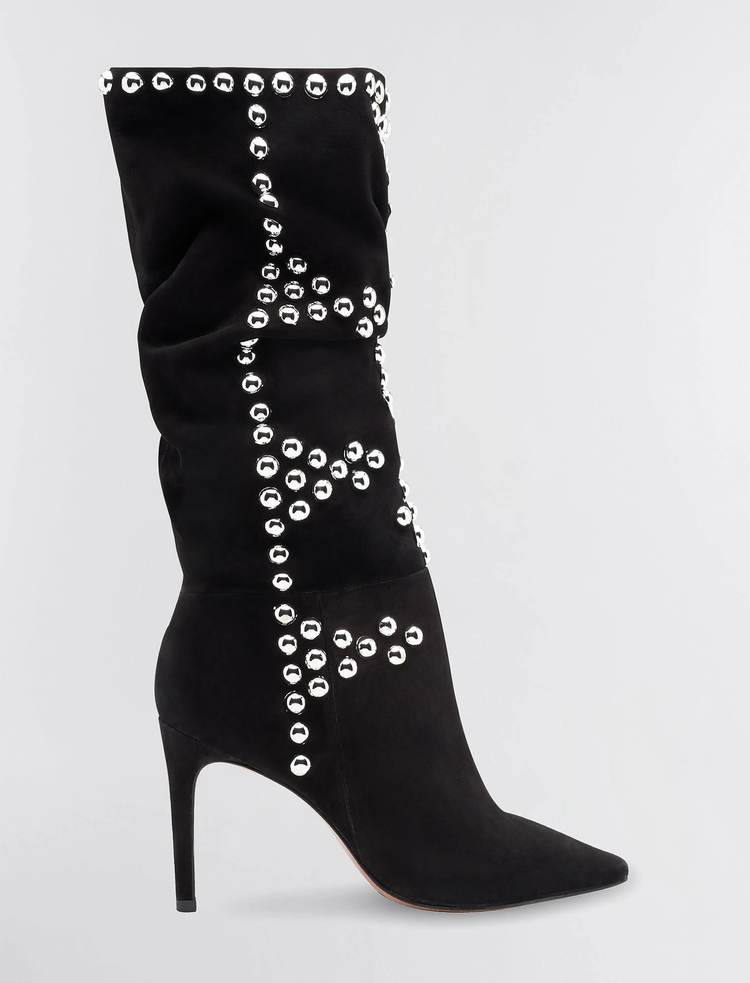 Embellished studs decorate a chic, tall high heeled boot. Crafted from leather in a relaxed, slouchy silhouette. Finished with a pointed toe and a sleek stiletto heel.