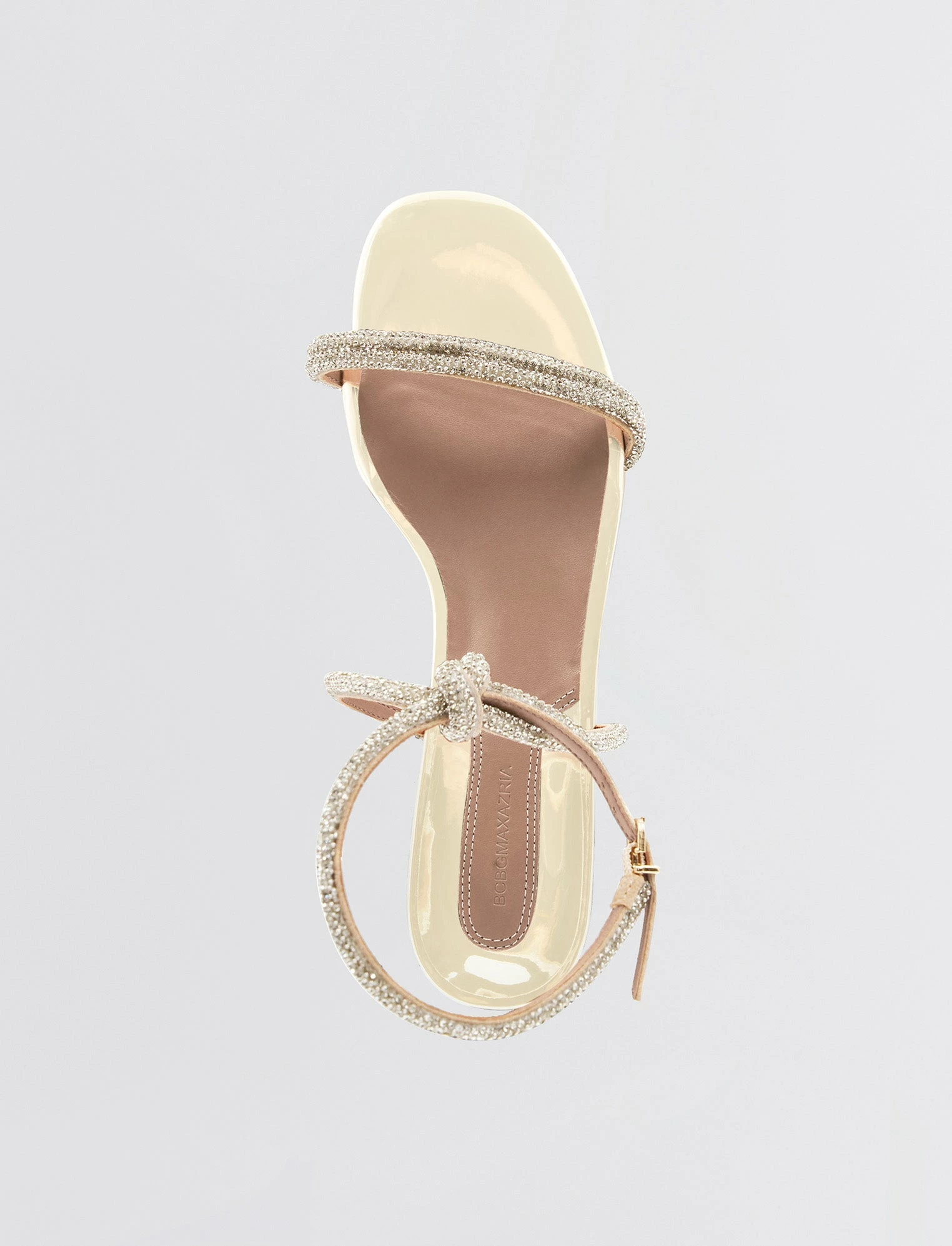 Dazzling crystals illuminate the straps of a glamorous sandal with a minimal aesthetic. Crafted with a square toe and a knotted ankle strap with an adjustable buckle.