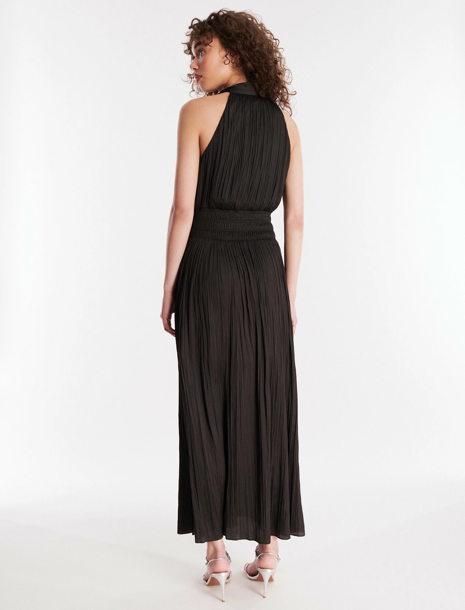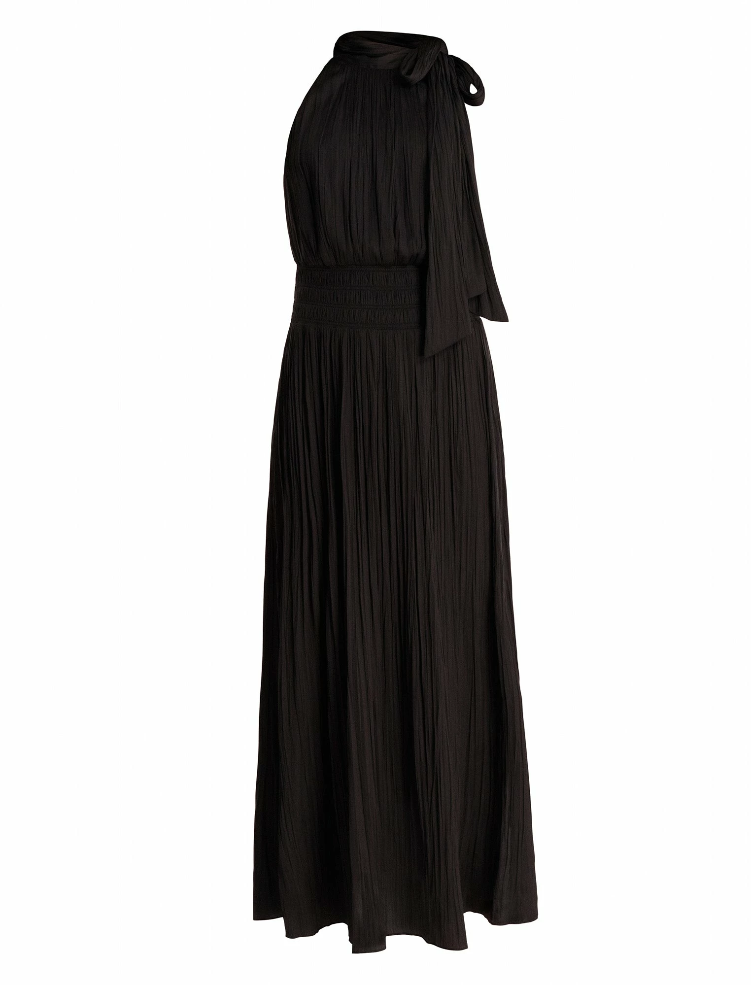 Classic dress made from textured broomstick satin in a pullover design. Topped with a halter neck defined by a self-tie bow. Smocked at the waist for an for an effortless blouson fit. Finished with a flowy skirt detailed with a side slit.