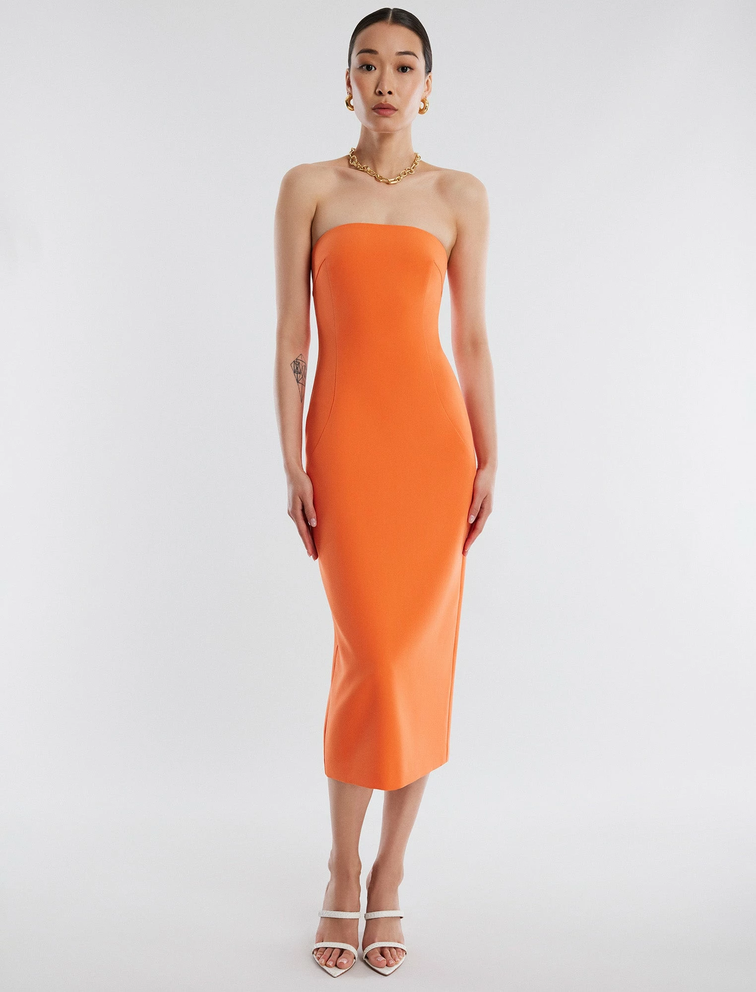 Sophisticated dress for just about any special occasion. Done in a sleek, minimal design with a strapless neckline and a midi-length hem that hits above the ankle. Cut from stretch crepe for a figure-flattering fit. Features a back vent and a concealed back zip.